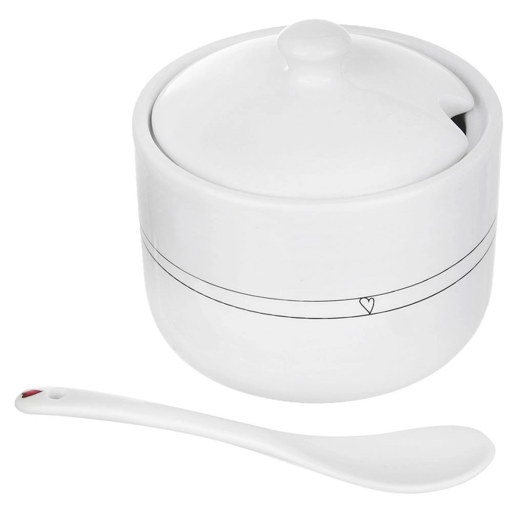 Deze stijlvolle suikerpot in klassiek wit combineert praktische bruikbaarheid met een decoratieve uitstraling. Dankzij het deksel met uitsparing blijft de inhoud beschermd en is het lepeltje altijd binnen handbereik. Het subtiele lijnmotief met een hartje en de kleine rode accent op het lepeltje geven een originele flair.
