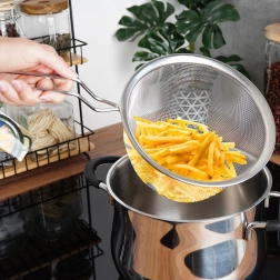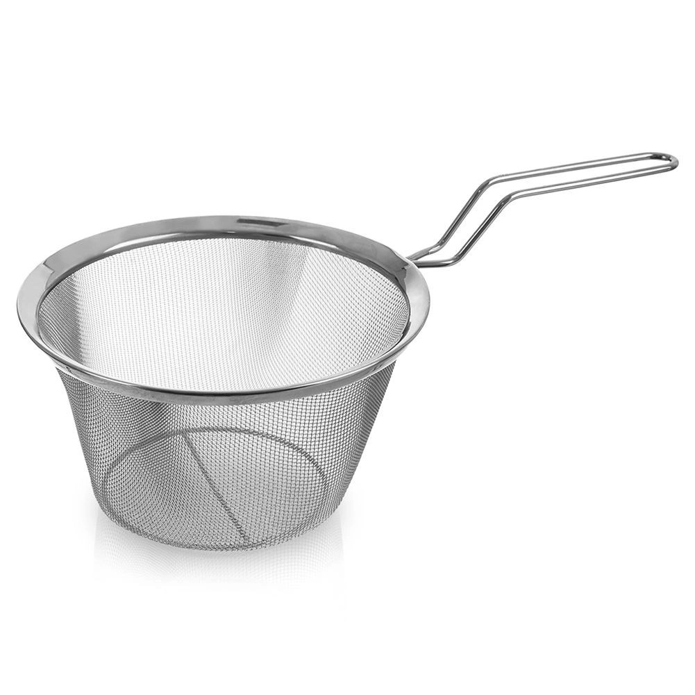 Het universele keukenmandje is een geweldige hulp voor dagelijks koken. Dankzij het fijne roestvrijstalen gaas giet je pasta, groenten of frituur je friet en knapperige chips snel en gemakkelijk af. De lange greep zorgt voor comfortabel en veilig vasthouden boven pot of pan.