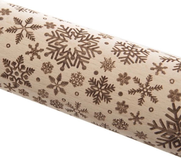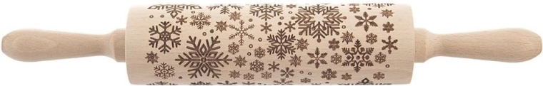 Houten reliëf-deegroller met patroon van sneeuwvlokken voor het eenvoudig decoreren van koekjes, gebak en fondant. Comfortabele roterende uitvoering met ergonomische handgrepen, hoogwaardig beukenhout met natuurlijke antibacteriële eigenschappen en snel decoreren zonder moeite.
