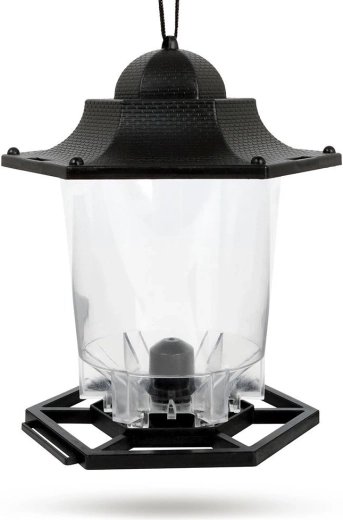 Praktische hangende vogelvoeder voor tuinvogels met afmetingen 14 × 13 × 17 cm en een transparant reservoir voor eenvoudige controle van het voer. Heeft een stevige constructie van kwaliteitskunststof, een zwart dak en een basis met zitplaatsen voor comfortabel voeren. Dankzij het koord hang je het eenvoudig aan een boom of haak op het balkon. Duurzame uitvoering, makkelijk bij te vullen en geschikt voor het hele jaar bijvoeren.