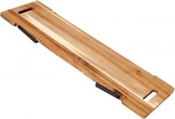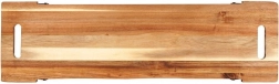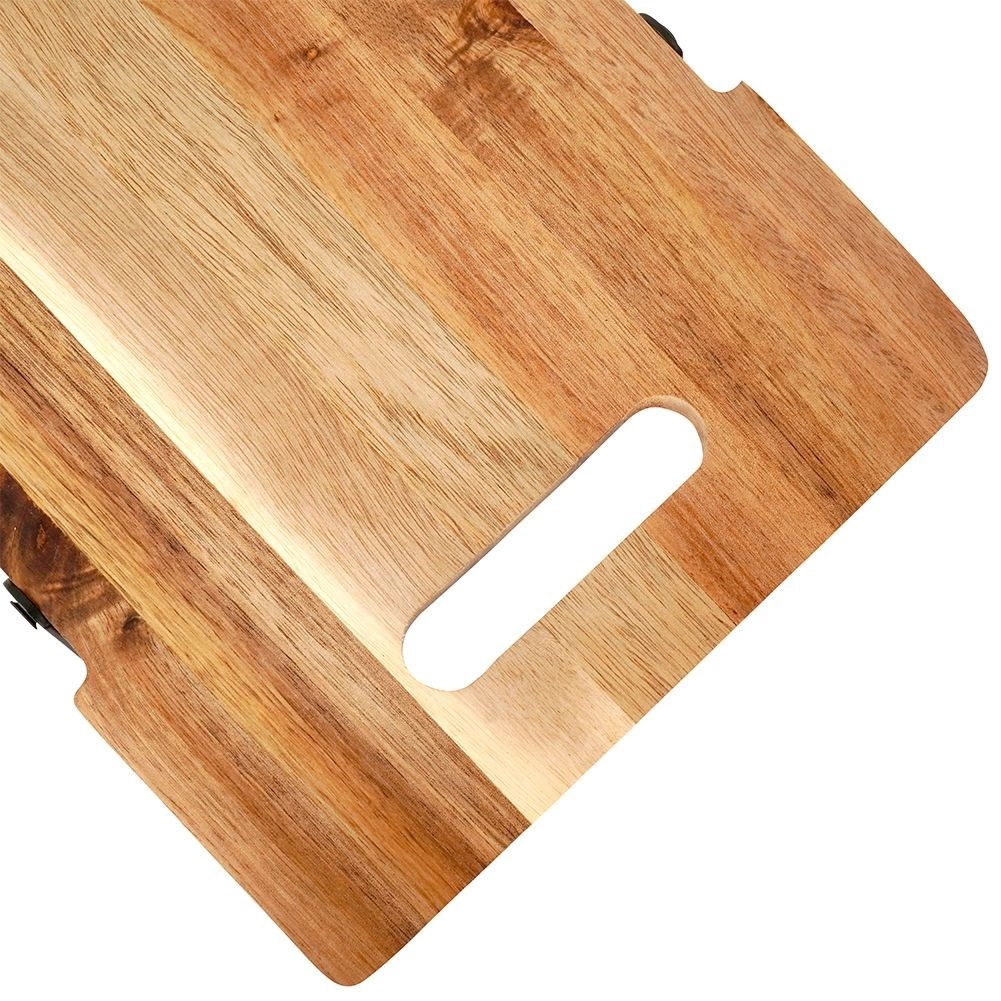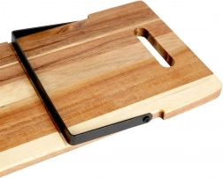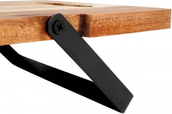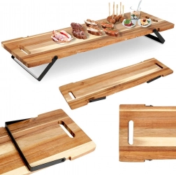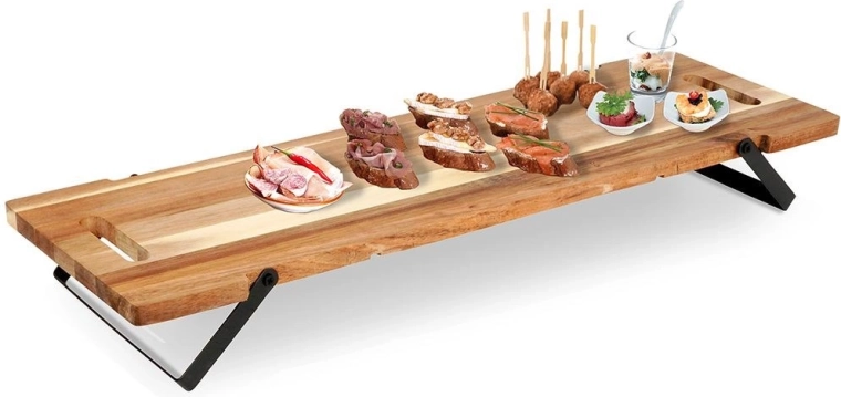 Deze lange serveerplank van acaciahout met inklapbare metalen poten tilt de presentatie van je gerechten naar een hoger niveau. Geïntegreerde grepen aan de zijkanten zorgen voor comfortabel en veilig dragen, terwijl de verhoogde positie het opscheppen vergemakkelijkt en de tafel overzichtelijk houdt.