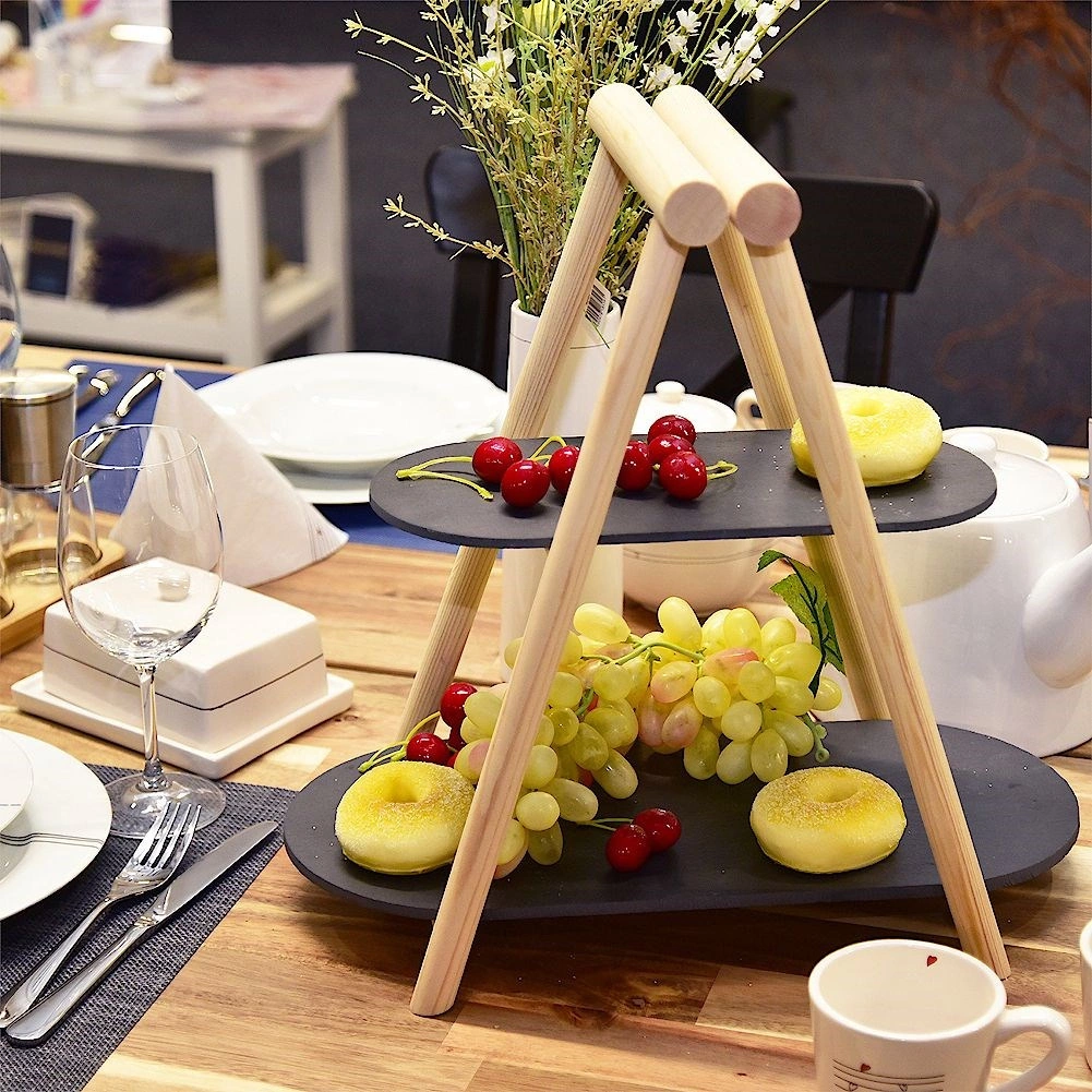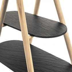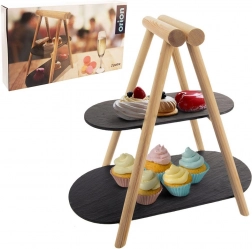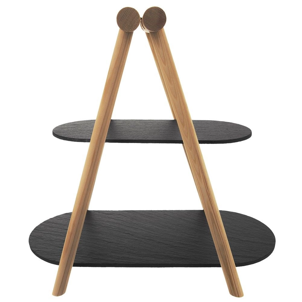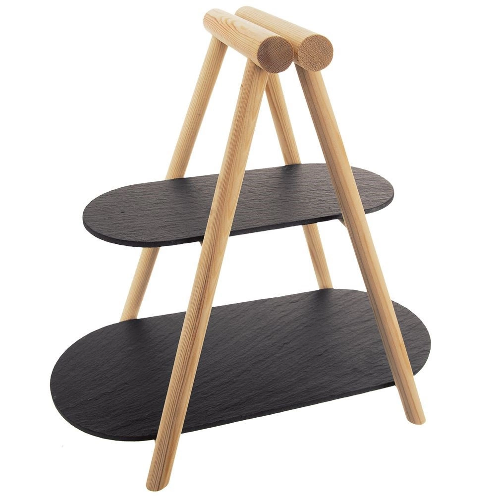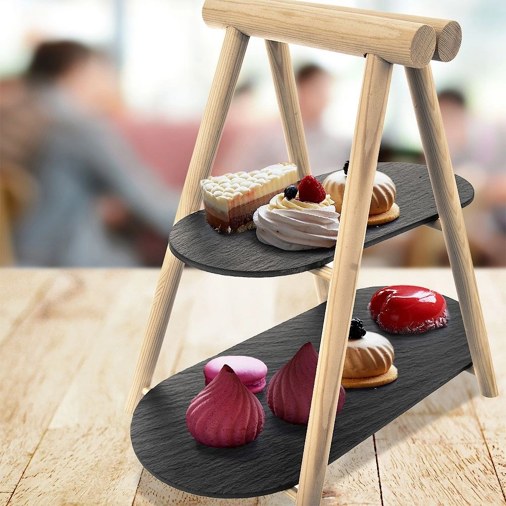 Deze design etagère met twee niveaus komt op elke tafel prachtig tot zijn recht. De combinatie van licht hout en donkere leistenen dienbladen oogt modern en tijdloos. Dankzij de twee niveaus bespaar je ruimte en presenteer je taartjes, fruit, kazen, vleeswaren of borrelhapjes opvallend mooi.