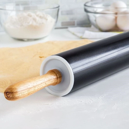 Bespaar tijd en moeite bij het bakken met een deegroller die een glad metalen oppervlak met antiaanbaklaag combineert met ergonomische houten handgrepen. De draaibare rol zorgt voor een soepele beweging, zodat je het deeg gelijkmatig uitrolt zonder te scheuren. Uitstekend geschikt voor zanddeeg, blader- en gistdeeg.