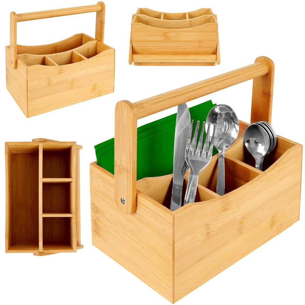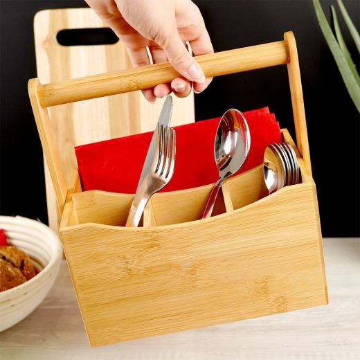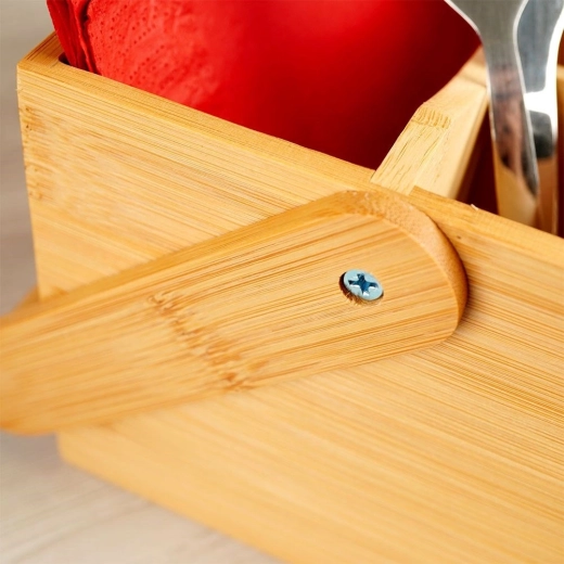 De organizer is gemaakt van bamboehout, dat uitblinkt in natuurlijke duurzaamheid, laag gewicht en een elegante look. Geschikt voor de eettafel thuis, maar ook voor restaurants, bistro’s en catering, waar hij het serveren van sauzen, kruiden en bestek vergemakkelijkt.