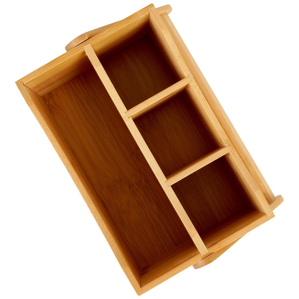 Deze veelzijdige houten organizer is een uitstekende hulp voor organisatie en serveren in huis en in de horeca. De vier vakken – drie kleinere en één grotere – bieden plek aan bestek, servetten, smaakmakers, sauzen en klein keukengerei. De robuuste handgreep zorgt voor veilig en comfortabel dragen van de keuken naar terras of tuin.