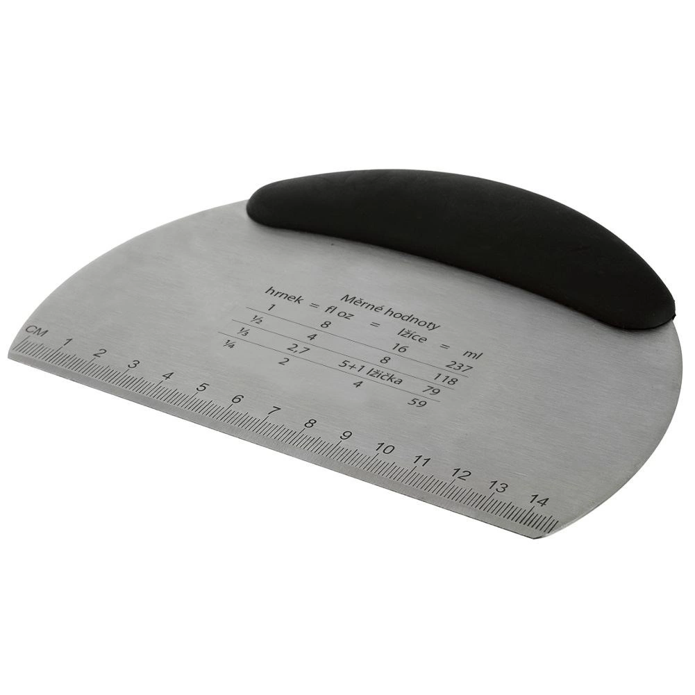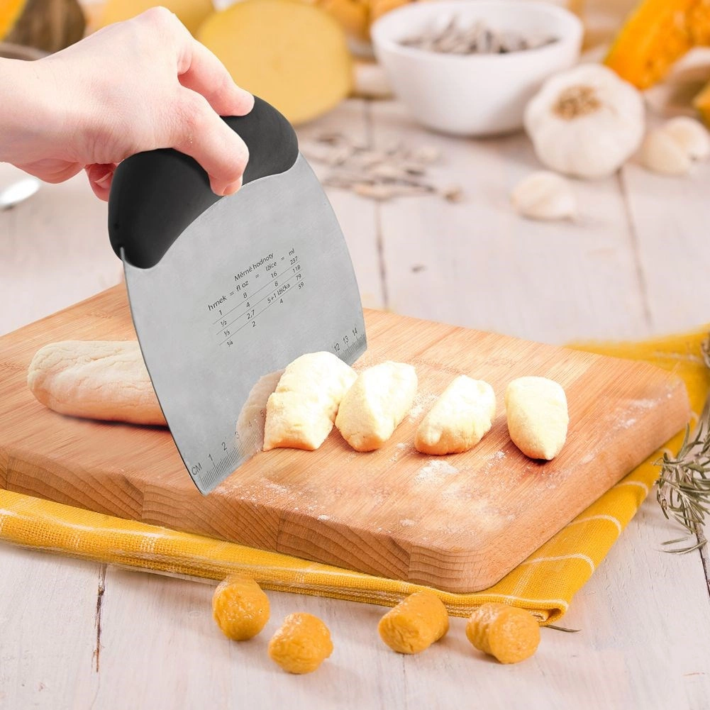 Deze multifunctionele schraper combineert een deegschraper, hakker en spatel in één. Perfect voor werken met deeg, crèmes en fondant, en vergemakkelijkt het overbrengen, portioneren en egaliseren van oppervlakken. Dankzij de scherpe rand hak je moeiteloos noten, ui of groente.