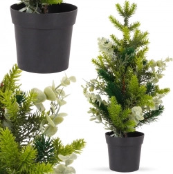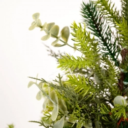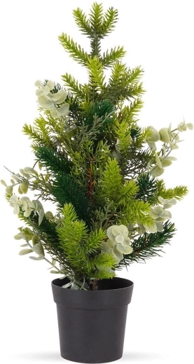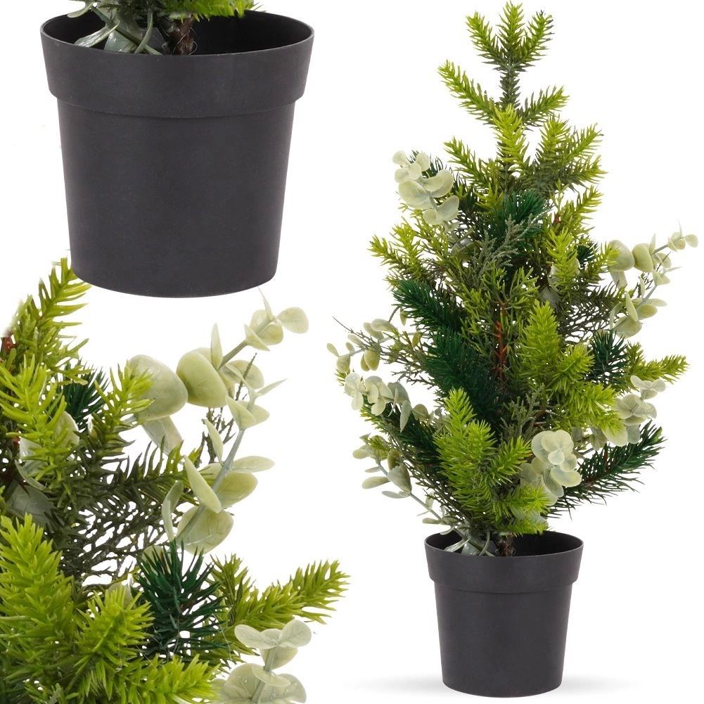 Elegante kunstboom met eucalyptusbladeren die mooi uitkomt op tafel, dressoir of bureau. Dankzij de hoogwaardige afwerking oogt hij natuurlijk en brengt hij kerstmagie in huis zonder gedoe met vallende naalden.