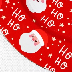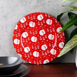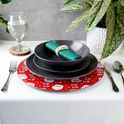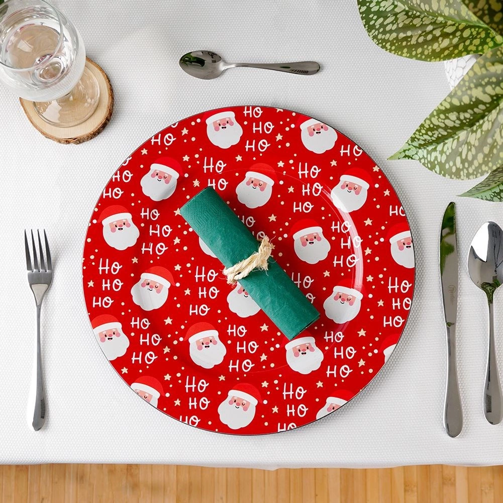 Breng de magie van Kerst naar je feesttafel met de rode onderzetter met een herhaald SANTA-motief en de tekst “Ho Ho Ho”. Het glanzende oppervlak en de opvallende print maken dit stuk tot een perfecte basis voor borden en feestelijke arrangementen. Ideaal voor familiediners, kerstonthaal en feestelijke decoraties.