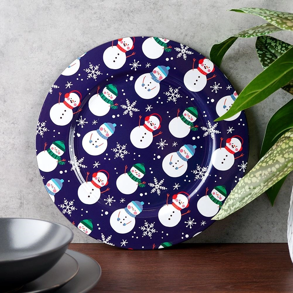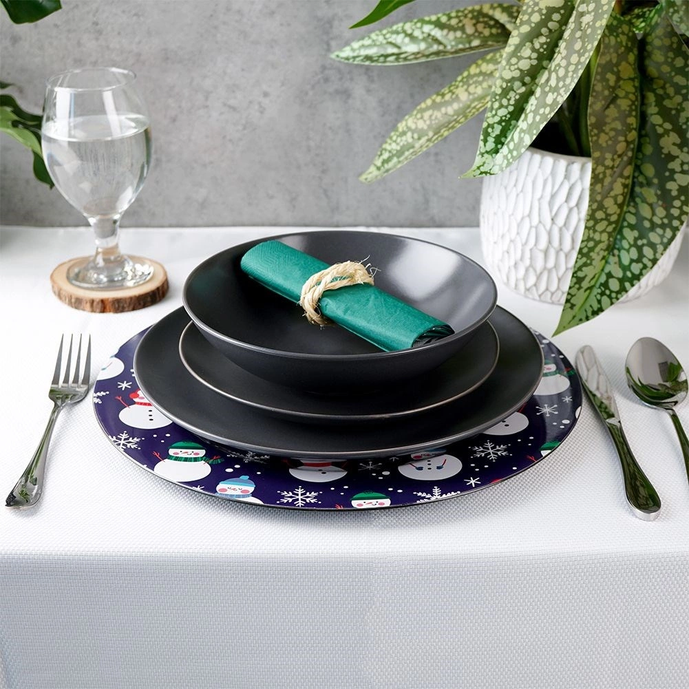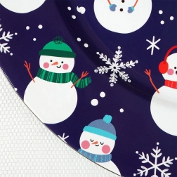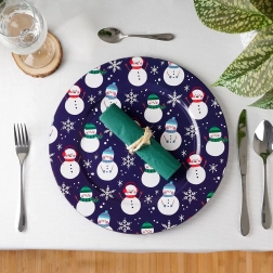 Het donkerblauwe oppervlak met sneeuwpoppen en vlokken zorgt direct voor een feestelijke sfeer en komt tot zijn recht bij elke tafelschikking.