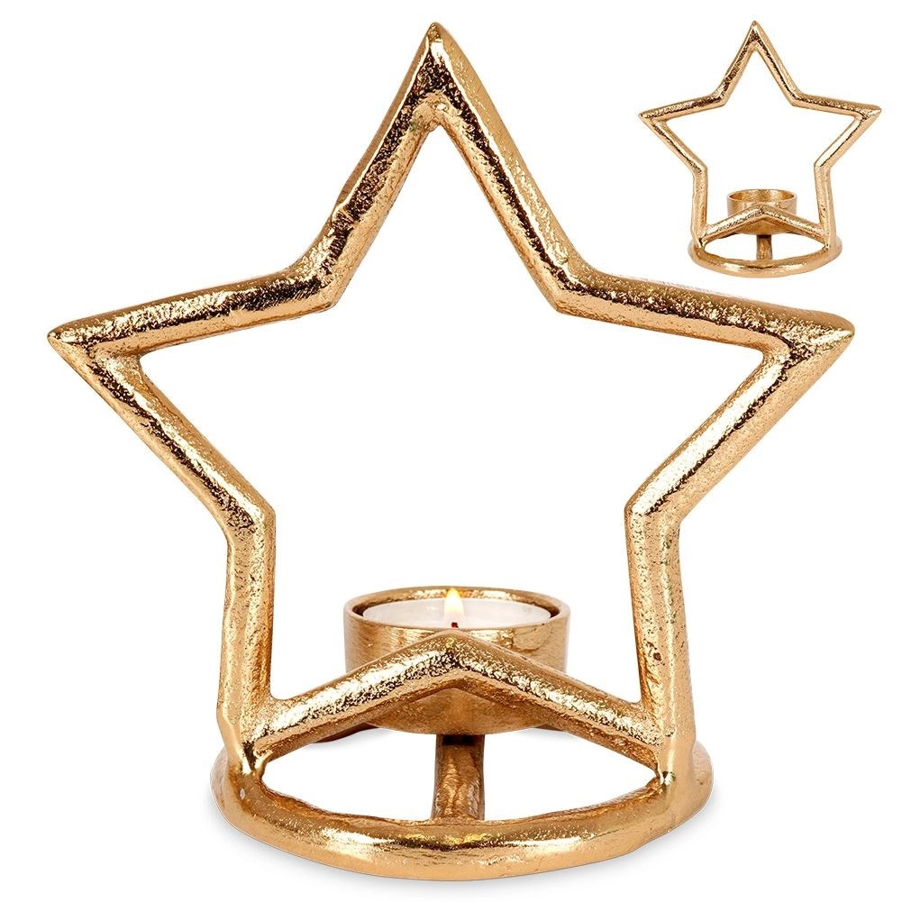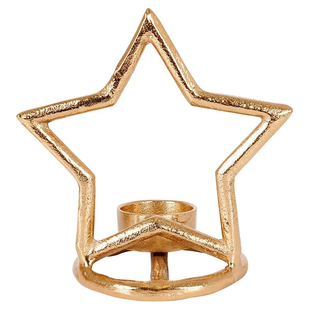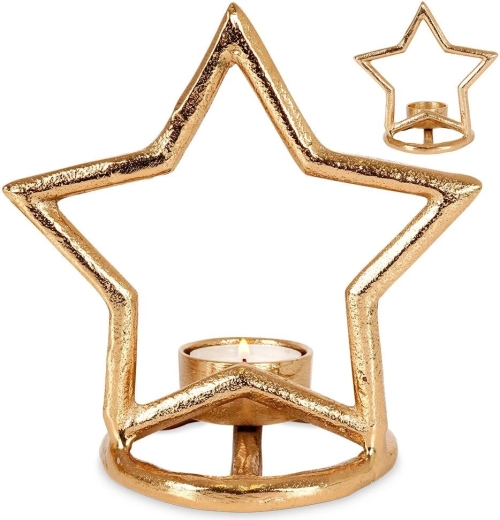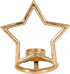 Elegante stervormige kandelaar van hoogwaardig aluminium in moderne goudtint, die tafel, plank of dressoir prachtig laat stralen. Ideaal voor theelichten en dankzij de stabiele ronde basis staat hij veilig op elk oppervlak. Het minimalistische uiterlijk past moeiteloos bij interieurs in LOFT-, industriële en Scandinavische stijl.