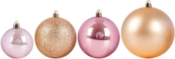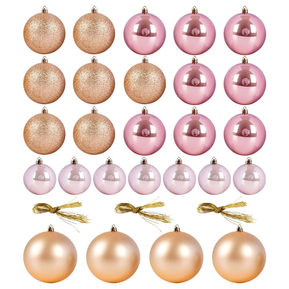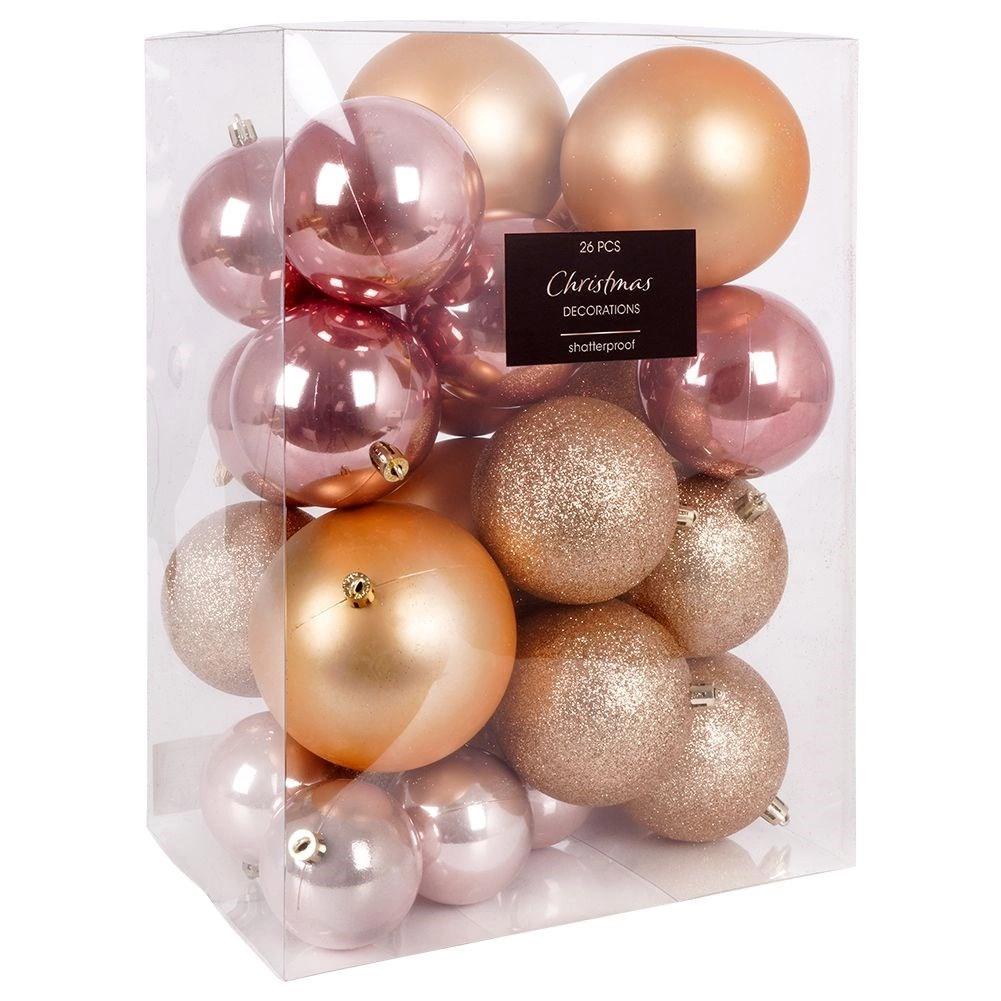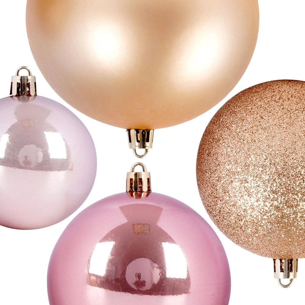 Met deze veelzijdige set in roze en roségouden tinten creëer je moeiteloos een stijlvolle kerstdecoratie. De verschillende formaten 6, 8 en 10 cm en de mix van afwerkingen (mat, glans, glitter) geven de boom diepte en sprankeling. De ballen zijn licht, duurzaam en dankzij de metalen oogjes eenvoudig op te hangen.