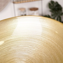 De stijlvolle gouden glazen kom wordt een opvallend element op je tafel. Dankzij de grote diameter van 30 cm en de inhoud van 2,2 liter is zij geschikt voor het serveren van groente- en fruitsalades, snacks of fruit en doet ze tevens dienst als decoratieve schaal.