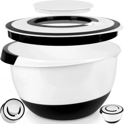 Deze ruime kom met een inhoud van 5 liter is de ideale hulp voor het bereiden van deeg, crèmes en slagroom. Het tweedelige deksel maakt het gemakkelijk om een handmixer te gebruiken zonder rommel – verwijder eenvoudig het middelste deel en de inhoud blijft veilig binnenin. Dankzij de antislipbodem staat de kom stabiel tijdens het werk en de schenktuit zorgt voor schoon en nauwkeurig overschenken.