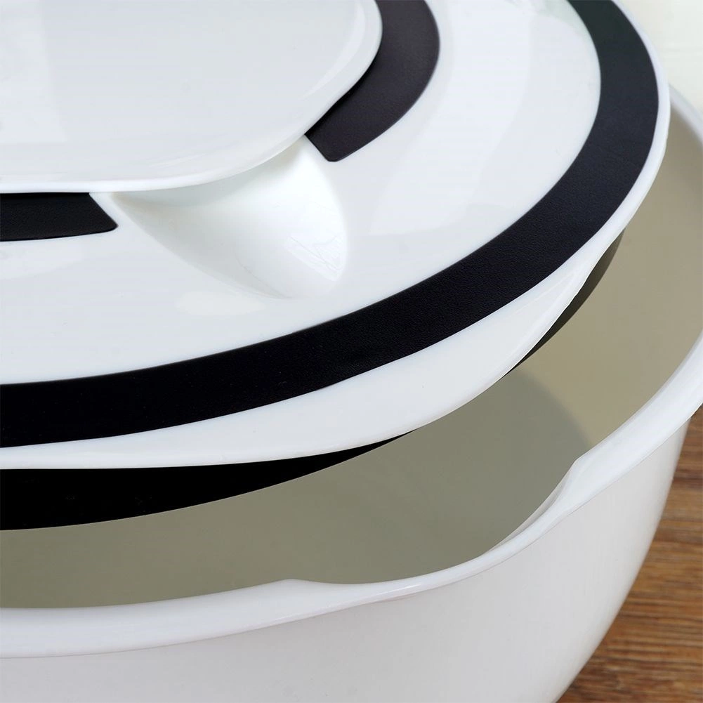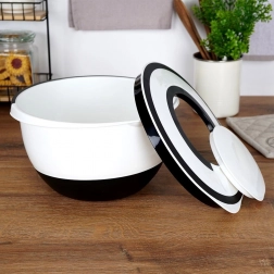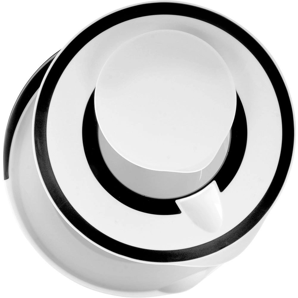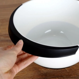 De kom is gemaakt van voedselveilige materialen, bestand tegen temperaturen van -30 °C tot +80 °C. Het onderhoud is eenvoudig dankzij vaatwasserbestendigheid. De elegante witte uitvoering met zwarte elementen past in elke keuken.