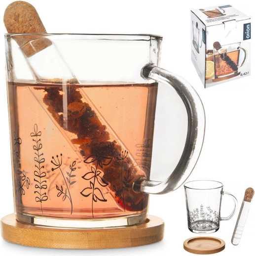 Geniet met elegantie van je favoriete thee of kruiden. De glazen mok van 400 ml wordt aangevuld met een glazen infuser met kurken dop en een glad bamboe schoteltje. Het transparante glas met subtiele botanische motieven laat de kleuren van de drank stralen en maakt van elk moment een klein ritueel.