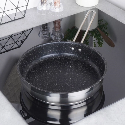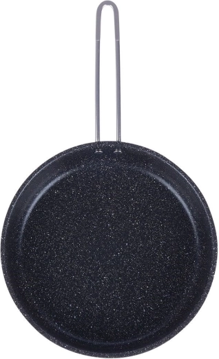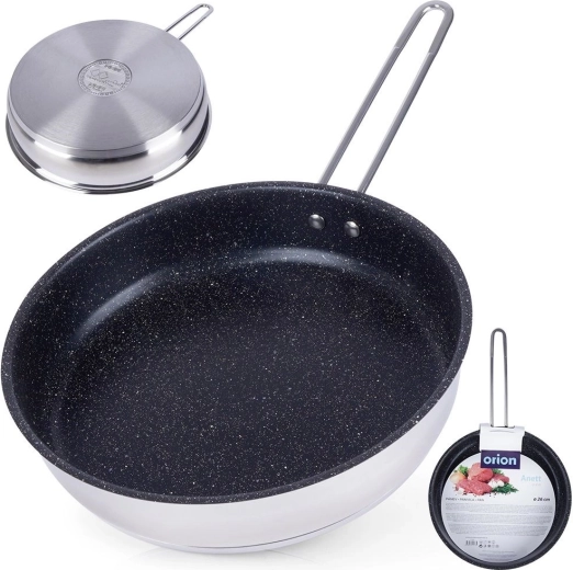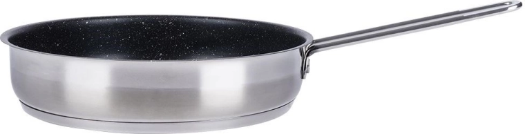Robuuste stalen pan met een diameter van 26 cm met een granieten antiaanbakafwerking voor gezond koken met minimaal vet. Heeft een meerlagige acute-thermische bodem voor snelle en gelijkmatige warmteverdeling, is krastbestendig en geschikt voor gas-, elektrische, keramische, halogeen- en inductiekookplaten. Vaatwasserbestendig en ook te gebruiken in de oven.