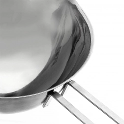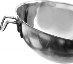 De lange handgreep ligt prettig in de hand en de zijkantshaak zorgt voor stabiliteit van de kom op de rand van de pan.