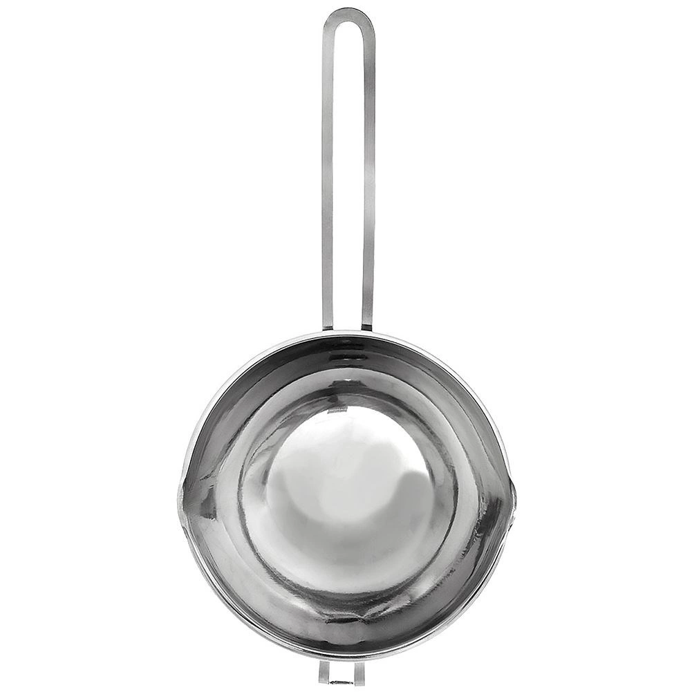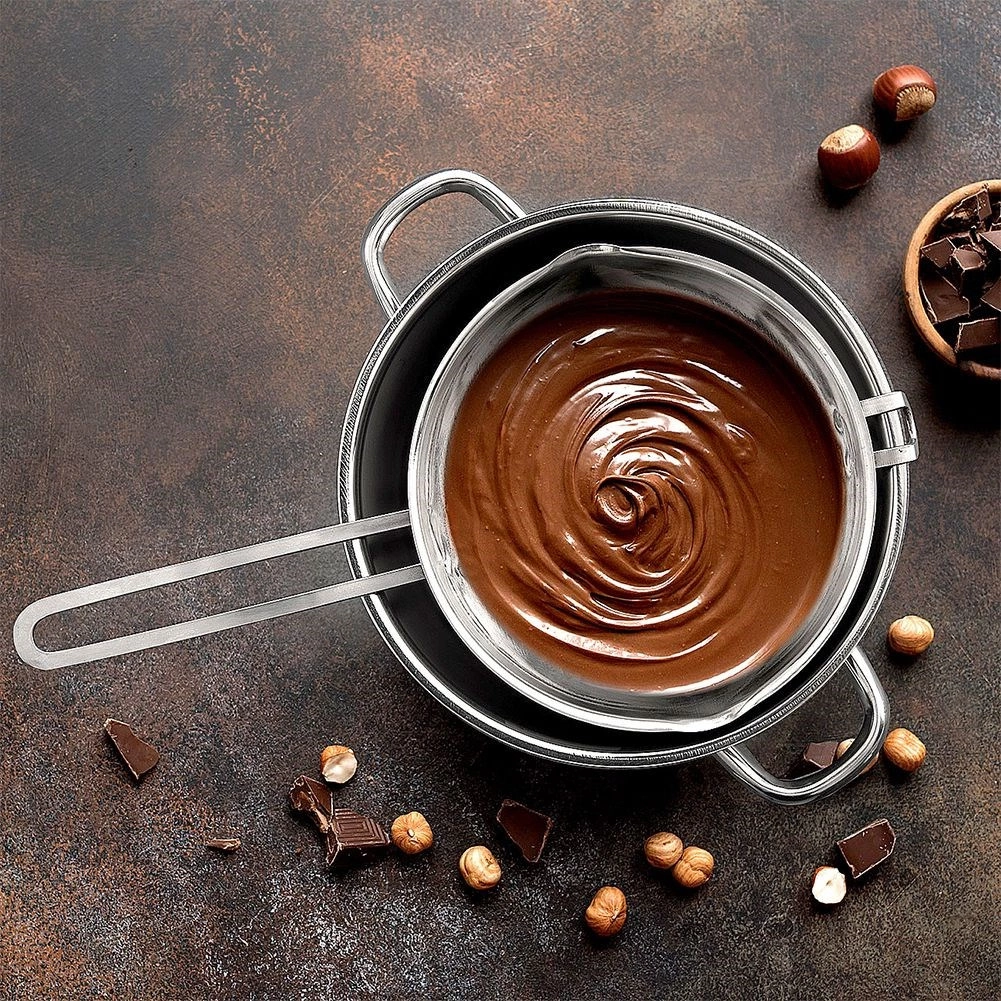 Twee schenktuiten aan de zijkant maken schoon overschenken van gesmolten ingrediënten eenvoudig. Het duurzame roestvrij staal is gemakkelijk te onderhouden, vaatwasserbestendig en veilig voor de gezondheid. Dankzij de doordachte vorm veeg je ook restjes chocolade eenvoudig uit.