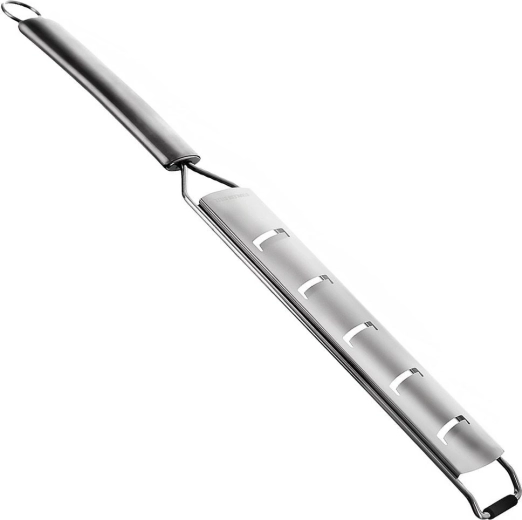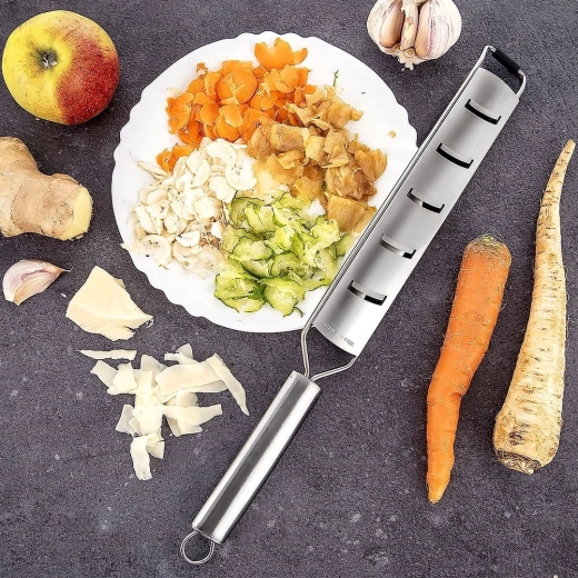 Praktische platte rasp van hoogwaardig roestvrij staal met vijf scherpe snijranden voor gelijkmatig schaven. Dankzij de lange handgreep ligt hij uitstekend in de hand, heeft hij een rubberen uiteinde voor stabiliteit, een beschermhoes voor veilig opbergen en is hij vaatwasmachinebestendig. Ideaal voor harde kazen, groenten, fruit, knoflook en gember.