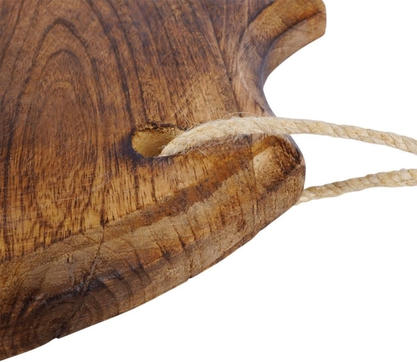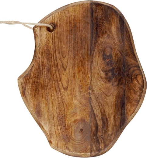 Stijlvolle plank van mangohout voor dagelijks snijden en fraai serveren. Heeft een natuurlijk onregelmatige vorm, een robuste dikte van 2 cm, een praktisch oog met koord om op te hangen en bestendigheid tegen vocht en vervorming. Ideaal voor het serveren van kazen en vleeswaren en als decoratief keukenaccessoire.
