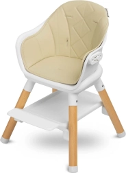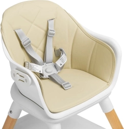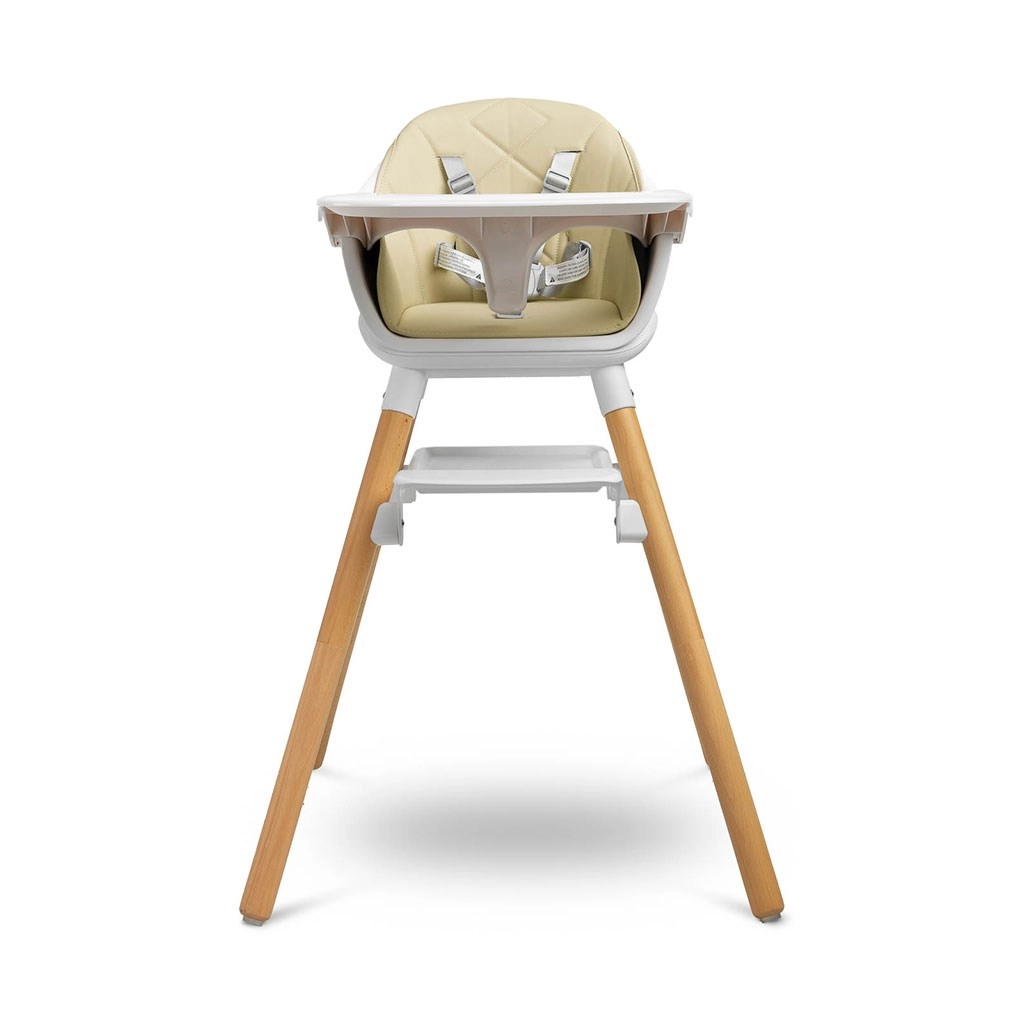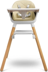 Het gevormde blad met afneembare bovenzijde minimaliseert knoeien tijdens het voeren en vergemakkelijkt het schoonmaken. Bekleding van ecologisch leer samen met de kunststof zitting hoeft alleen maar te worden afgenomen. Voor maximale veiligheid zorgen vier massieve houten poten met antislipdoppen en een verstelbare vijfpunts veiligheidsgordel. Het product voldoet aan de norm EN 14988:2017+A1:2020.