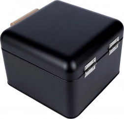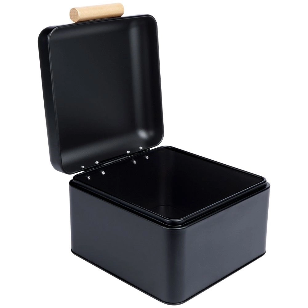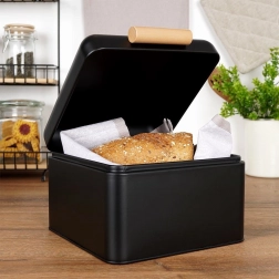 Stijlvolle metalen broodtrommel in matte zwarte kleur is een uitstekende keuze voor overzichtelijke en hygiënische opslag van brood en banket. Dankzij de compacte afmetingen van 22 × 20 × 14 cm neemt hij weinig plaats in op het aanrecht en biedt hij toch ruimte voor een klein brood, meerdere broodjes of pistoletjes.