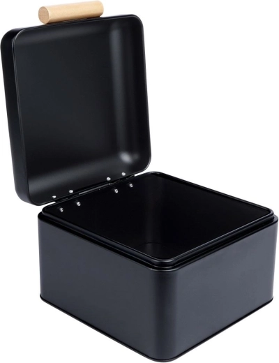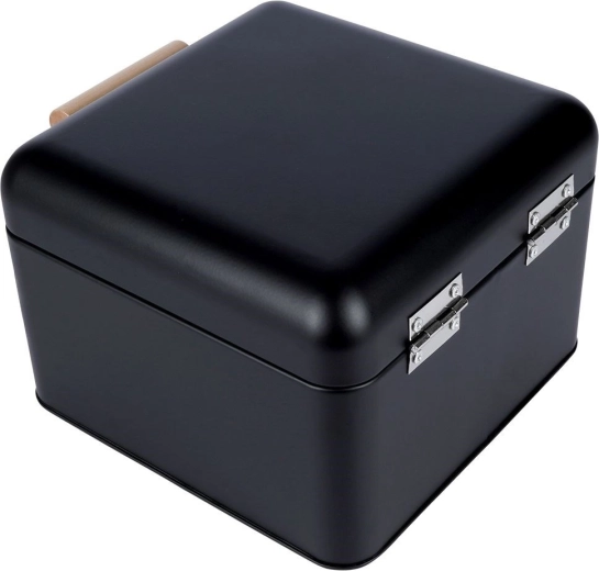 Elegante zwarte broodtrommel van hoogwaardig metaal houdt je brood en gebak langer vers en altijd binnen handbereik. De compacte afmetingen besparen ruimte, het praktische scharnierdeksel met houten handgreep zorgt voor comfortabel openen en sluiten. Het minimalistische design past in elke keuken en geeft een moderne uitstraling.