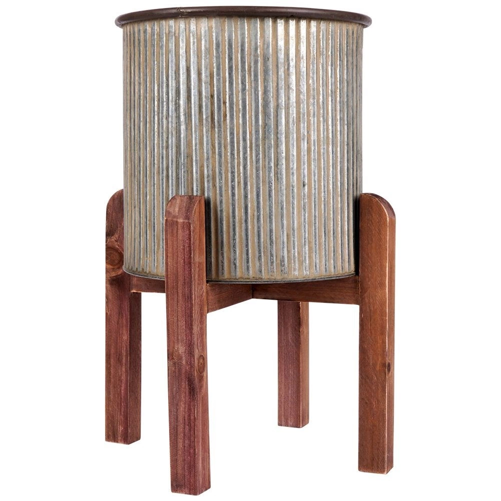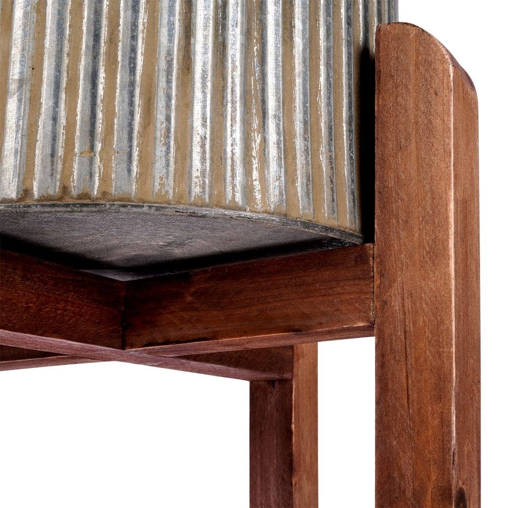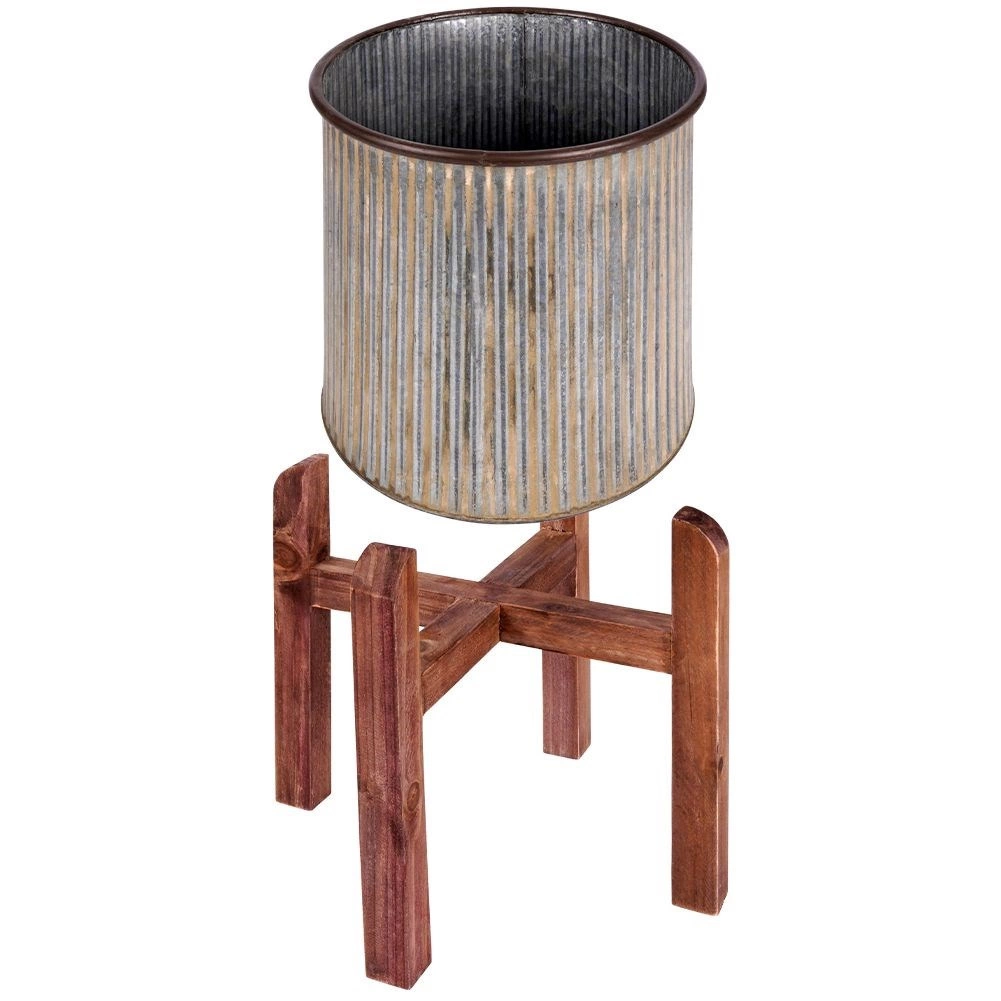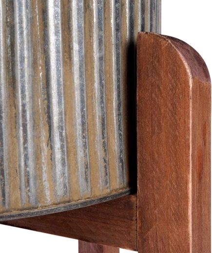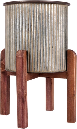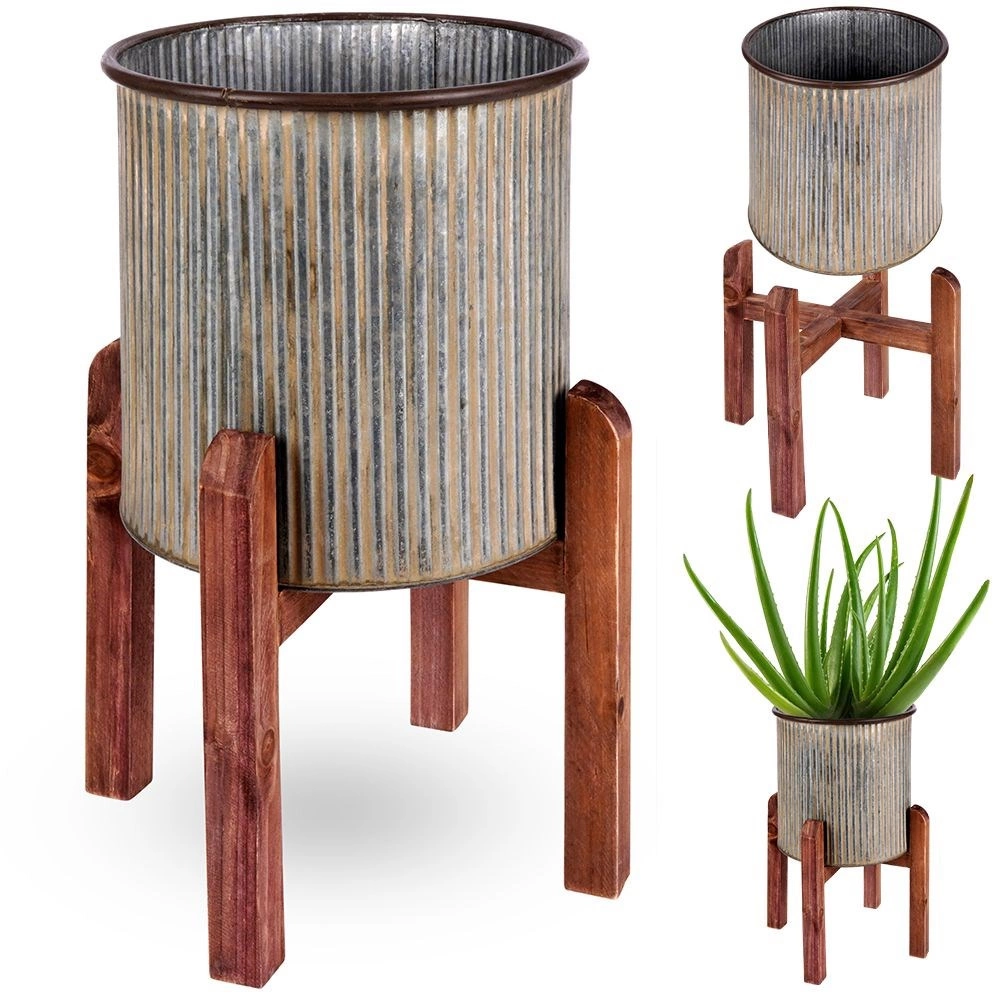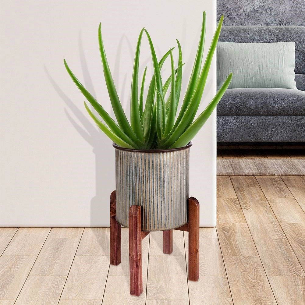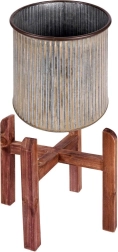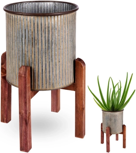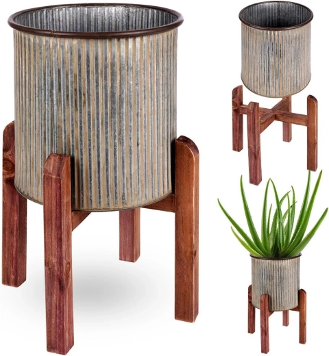 Deze designplantenpot op standaard accentueert de schoonheid van je planten en verandert ze in een opvallend decoratief element. De metalen pot met verticale ribbels oogt elegant en is tegelijk duurzaam, terwijl de houten standaard een warme, natuurlijke toets toevoegt en stevige ondersteuning biedt.
