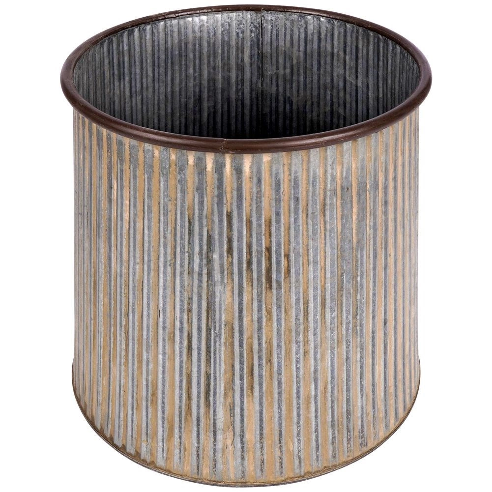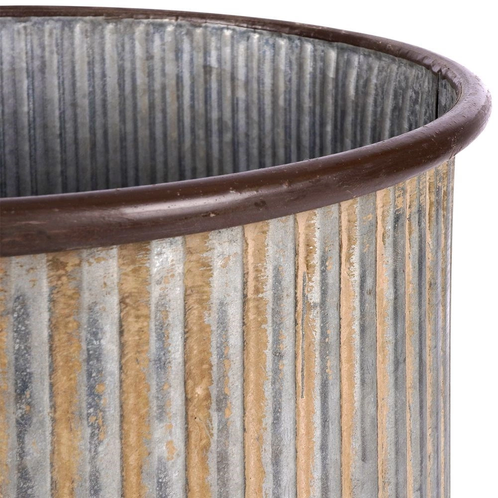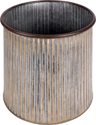 Verouderd zilverkleurig staal met verticale groeven voegt flair toe en beschermt de pot tegelijk tegen beschadiging.