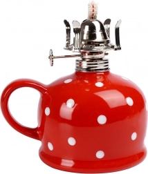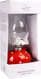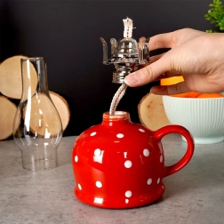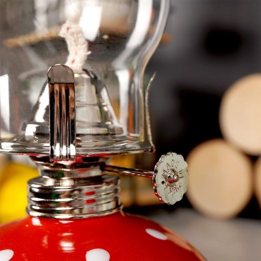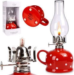 Traditionele petroleum-/olielamp in een elegant retro design combineert een decoratieve uitstraling met betrouwbaar licht zonder elektriciteit. De glazen schoorsteen beschermt de vlam effectief en laat voldoende licht door, de keramische tank in het rood met witte stippen is een opvallend designelement.