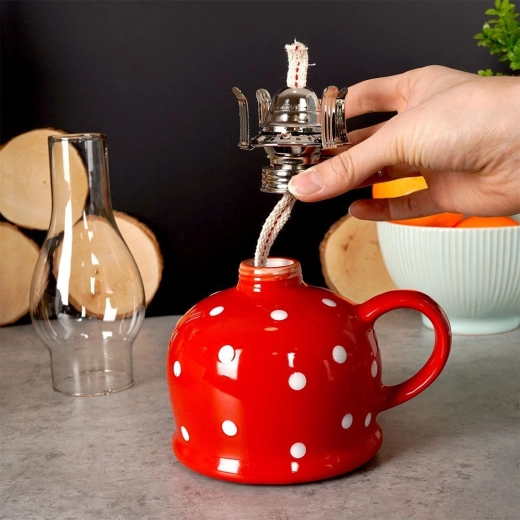 Stijlvolle keramische olielamp in retro design met een inhoud van 530 ml en een hoogte van 28,5 cm die voor aangenaam sfeervol licht zorgt thuis, in het zomerhuisje en bij stroomuitval. Voorzien van een duurzame glazen schoorsteen, een metalen brander met lontregeling en een praktisch handvat om te dragen. De rode body met witte stippen geeft je interieur vintage charme en een romantische sfeer.