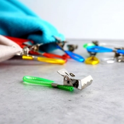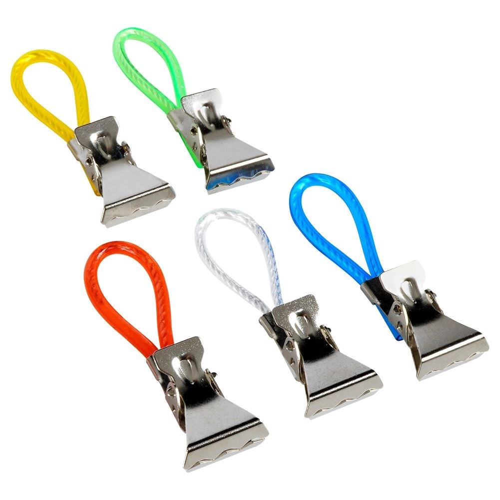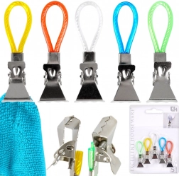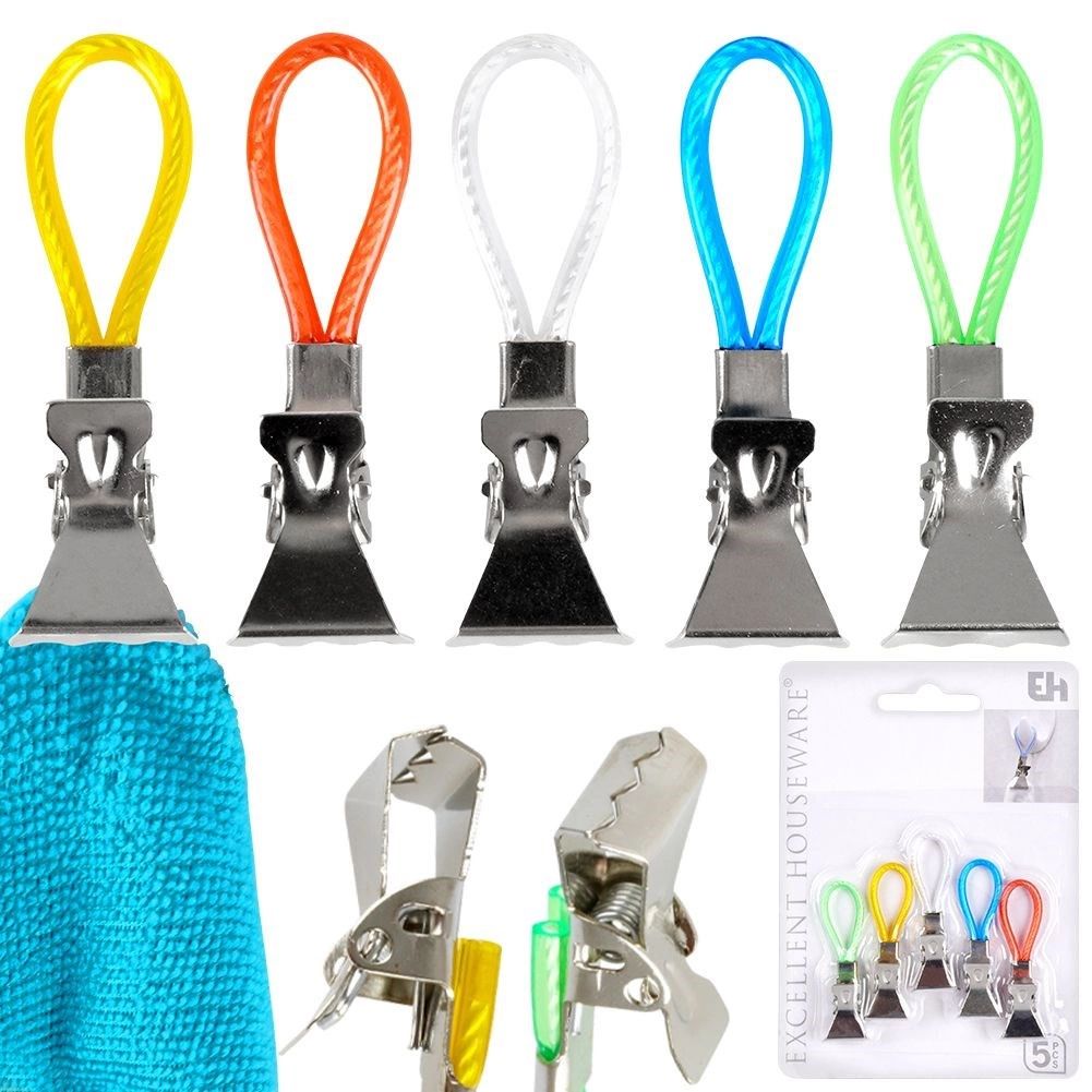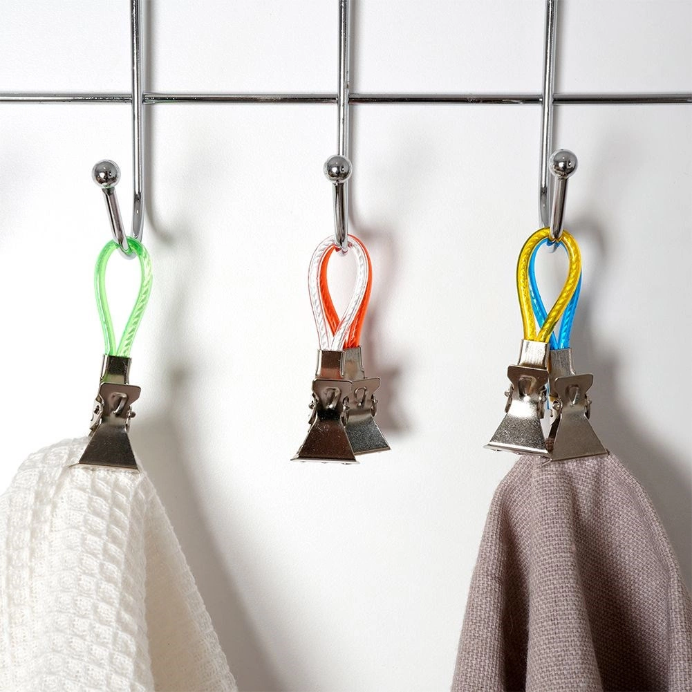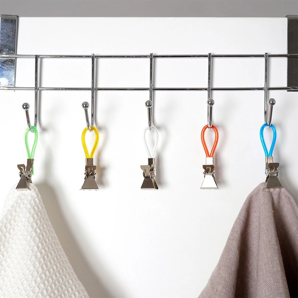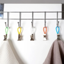 Ontdek een eenvoudige manier om handdoeken en theedoeken altijd binnen handbereik en netjes opgehangen te houden. Metalen clips met gekleurde lusjes maken snel ophangen aan een haak, stang of rek mogelijk en dankzij de getande kaken houden ze stevig vast, zelfs aan gladdere stoffen. De verschillende kleuren lussen maken het makkelijk om handdoeken per gezinslid te onderscheiden.