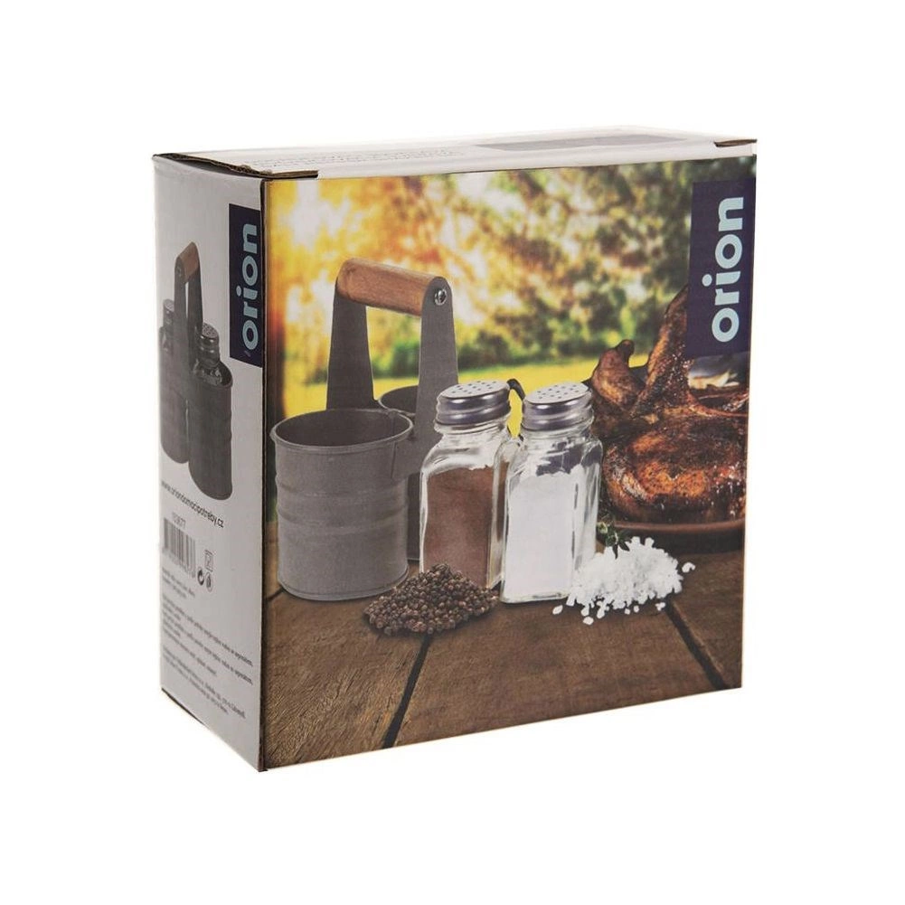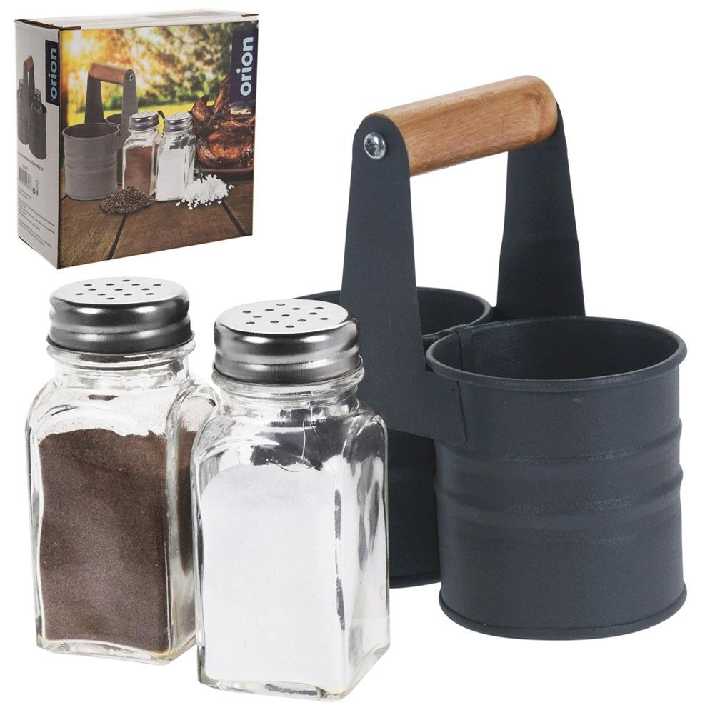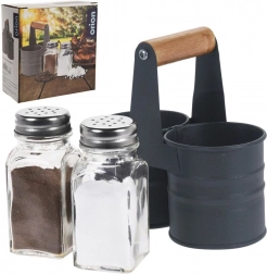 Stijlvolle set voor dagelijks op smaak brengen: twee vierkante glazen strooiers met duurzame roestvrijstalen deksels in een stabiele metalen houder. Het houten handvat zorgt voor veilig en comfortabel dragen in de keuken en aan tafel. Dankzij het transparante glas zie je altijd hoeveel zout en peper er nog in zit.
