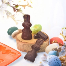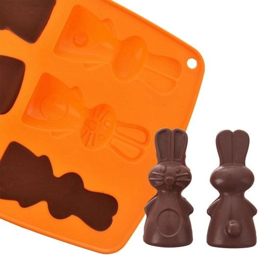 De siliconen vorm in oranje maakt het gemakkelijk om heerlijke koekjes, pralines of chocolaatjes in de vorm van konijntjes te bereiden. Dankzij het anti-aanbak en flexibele siliconen haal je de lekkernijen er eenvoudig uit zonder het model te beschadigen. De vorm neemt geen geuren of smaken op en is ruimtebesparend bij het opbergen.