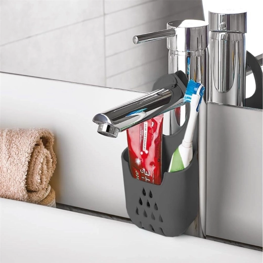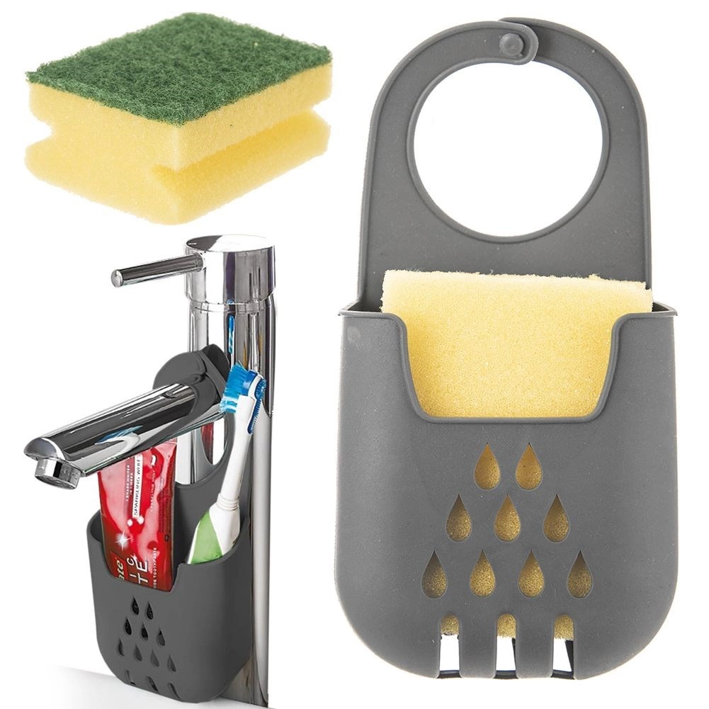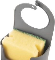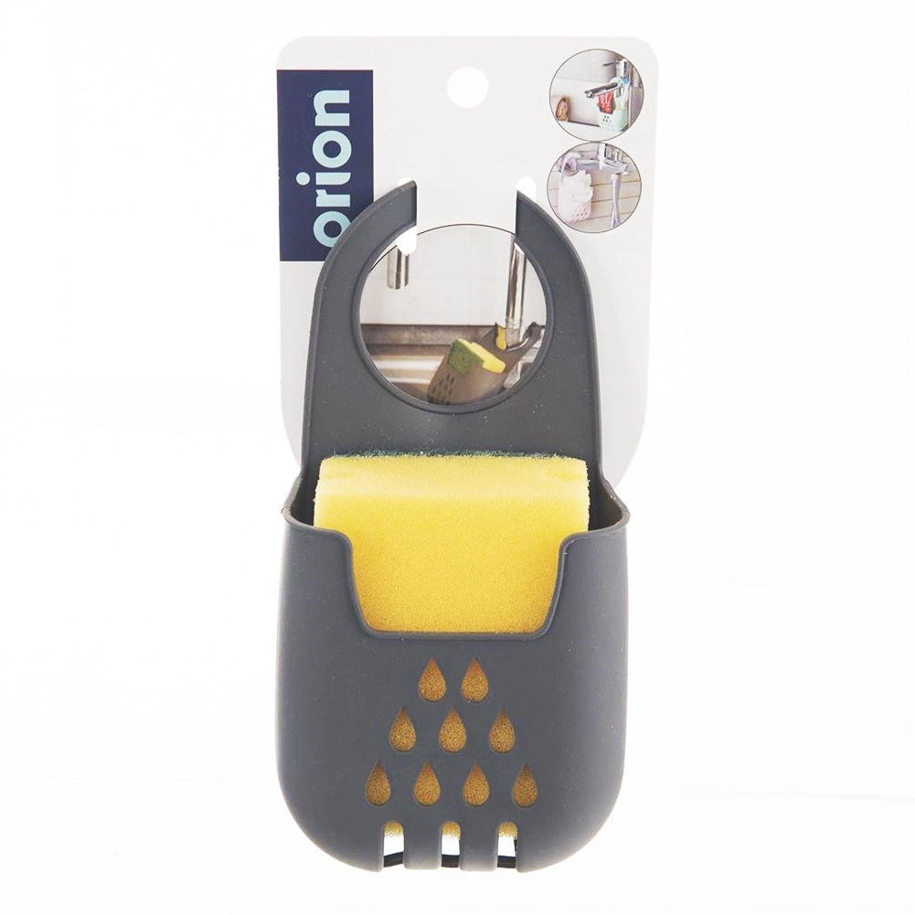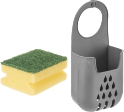 Praktische hangende sponshouder die eenvoudig aan de kraan te bevestigen is en je keuken schoon en overzichtelijk houdt. Dankzij de afvoergaten droogt de spons snel, blijft hij hygiënisch en altijd binnen handbereik. Gemaakt van duurzaam materiaal in elegant grijs. Eenvoudige installatie, sneldrogend en ruimtebesparend bij de gootsteen.