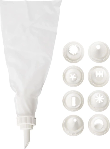 In de verpakking vind je 9 verschillende spuitmonden voor sterretjes, lijnen, puntjes en bloemmotieven. De praktische oplossing maakt snel wisselen van spuitmond mogelijk, zelfs tijdens het werk – zonder de vulling uit de zak te halen. De set is ook ideaal voor het vormen van schuimpjes, het vullen van soesjes of het decoreren van hartige hapjes.