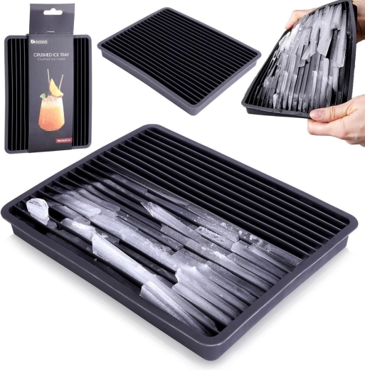 Praktische vorm voor het bereiden van crushed ice met afmetingen 18 × 14,5 × 2 cm. Dankzij het flexibele materiaal hoef je na het bevriezen het water in de vorm alleen licht in te drukken en krijg je perfect fijngestampt ijs voor drinks, cocktails en limonades. Veilig materiaal voor contact met voedsel, geschikt voor de vaatwasser en ideaal voor thuisgebruik en professionele bars.