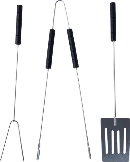Praktische barbecueset van sterk staal met een spatel, tang en vork van 38 cm. Dankzij de lange handgrepen blijf je op veilige afstand van de grill, duurzame materialen zorgen voor een lange levensduur en comfortabele antislipgrepen maken het hanteren van voedsel thuis en in de tuin gemakkelijker.