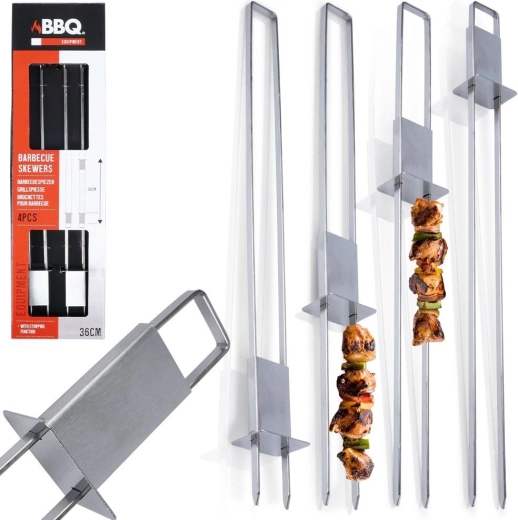 Praktische set van 4 dubbele spiesen van 36 cm voor het eenvoudig grillen van vlees en groenten. Dankzij de twee punten blijven de ingrediënten stevig op hun plaats en draaien ze niet mee. Gemaakt van hoogwaardige roestvrij staal, geschikt voor hergebruik, met comfortabele platte handgrepen voor zeker draaien en hanteren. Ideaal voor barbecue en oven.