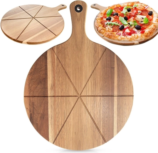 Praktische houten pizzaplank van acaciahout met lang handvat en geleidegroeven voor 6 gelijkmatige stukken. Hij is dubbelzijdig – één zijde met geleiders voor precies snijden, de andere glad voor het serveren van kazen, vleeswaren of brood. Licht, duurzaam en vochtbestendig, voorzien van een oog om op te hangen voor eenvoudige opslag.