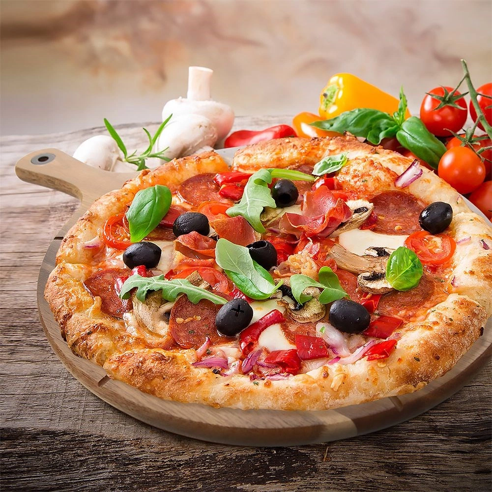 Deze robuuste en tegelijk lichte plank van acaciahout maakt het snijden en stijlvol serveren van pizza eenvoudig. De groeven aan de werkzijde verdelen het oppervlak in zes gelijke delen, zodat elk snijmoment snel, precies en veilig is. De gladde zijde is ideaal voor het serveren van kazen, vleeswaren, brood of desserts.