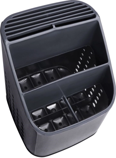 Hoogwaardige kunststof in het zwart met grafietdetails oogt modern en past in de meeste keukens. Bij het verwijderen van de binnenste organizer krijg je een ruime enkelvoudige container, bijvoorbeeld voor groter gerei. Dankzij de compacte afmetingen past hij zowel op het afdruiprek van de gootsteen als op het aanrecht zonder in de weg te staan.