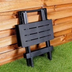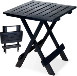 Compacte opvouwbare tuintafel in elegant zwart, ideaal voor tuin, balkon en kamperen. Tafelblad van 44 × 44 cm, hoogte 50 cm en een draagvermogen tot 12 kg. Lichtgewicht, weerbestendig en waterbestendig. Dankzij het snel opvouwen en de praktische handgreep is hij makkelijk te dragen en neemt hij weinig ruimte in.