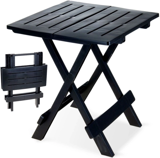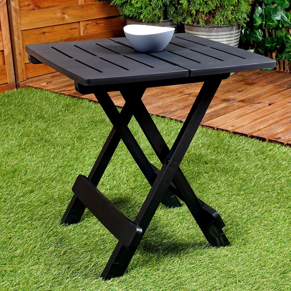 Zoek je een praktische en veelzijdige tafel voor buiten? Deze opvouwbare tuintafel in het zwart is een uitstekende keuze voor de tuin, het balkon, het terras en op reis. De stabiele constructie met vier poten zorgt voor betrouwbaar gebruik, of het nu is voor serveren, het neerzetten van drankjes, of als onderstel voor planten en decoraties.