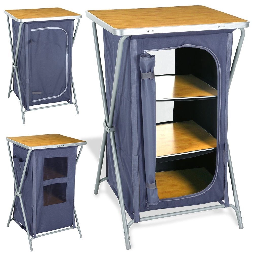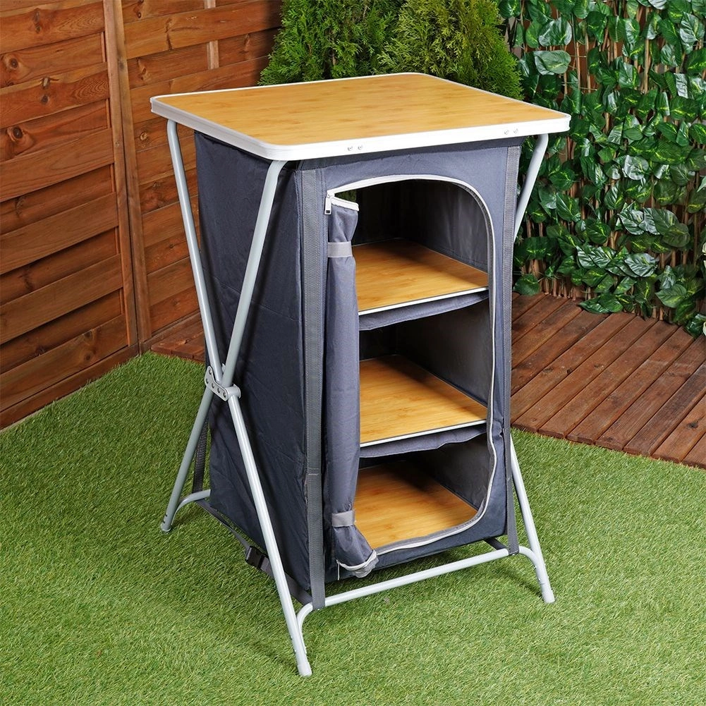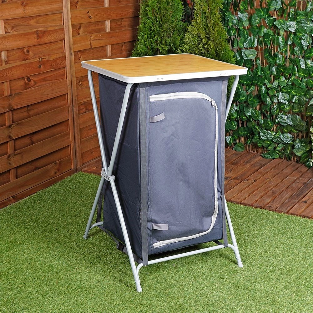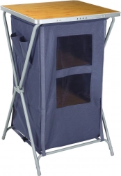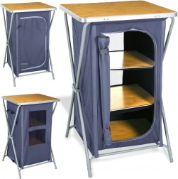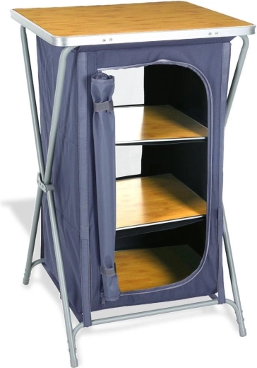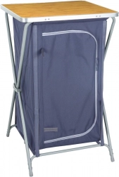 Met deze opvouwbare kampeerkast krijgt u een overzichtelijke en hygiënische opbergruimte voor onderweg. Het duurzame stalen frame, de hoogwaardige polyester stof in donkergrijs en het bovenblad van MDF met houtlook vormen een stevige en toch mobiele combinatie die u eenvoudig opzet en weer inklapt.