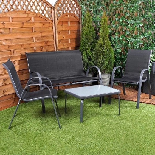 De tijdloze combinatie van grijs metaal en zwart gaas past in zowel moderne als klassieke tuinen. De fauteuils en de bank hebben comfortabele armleuningen.