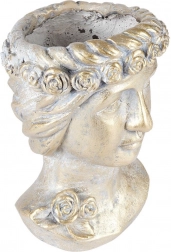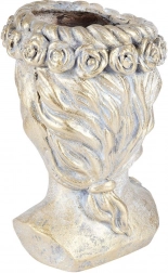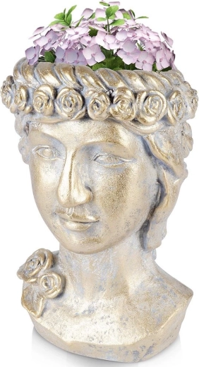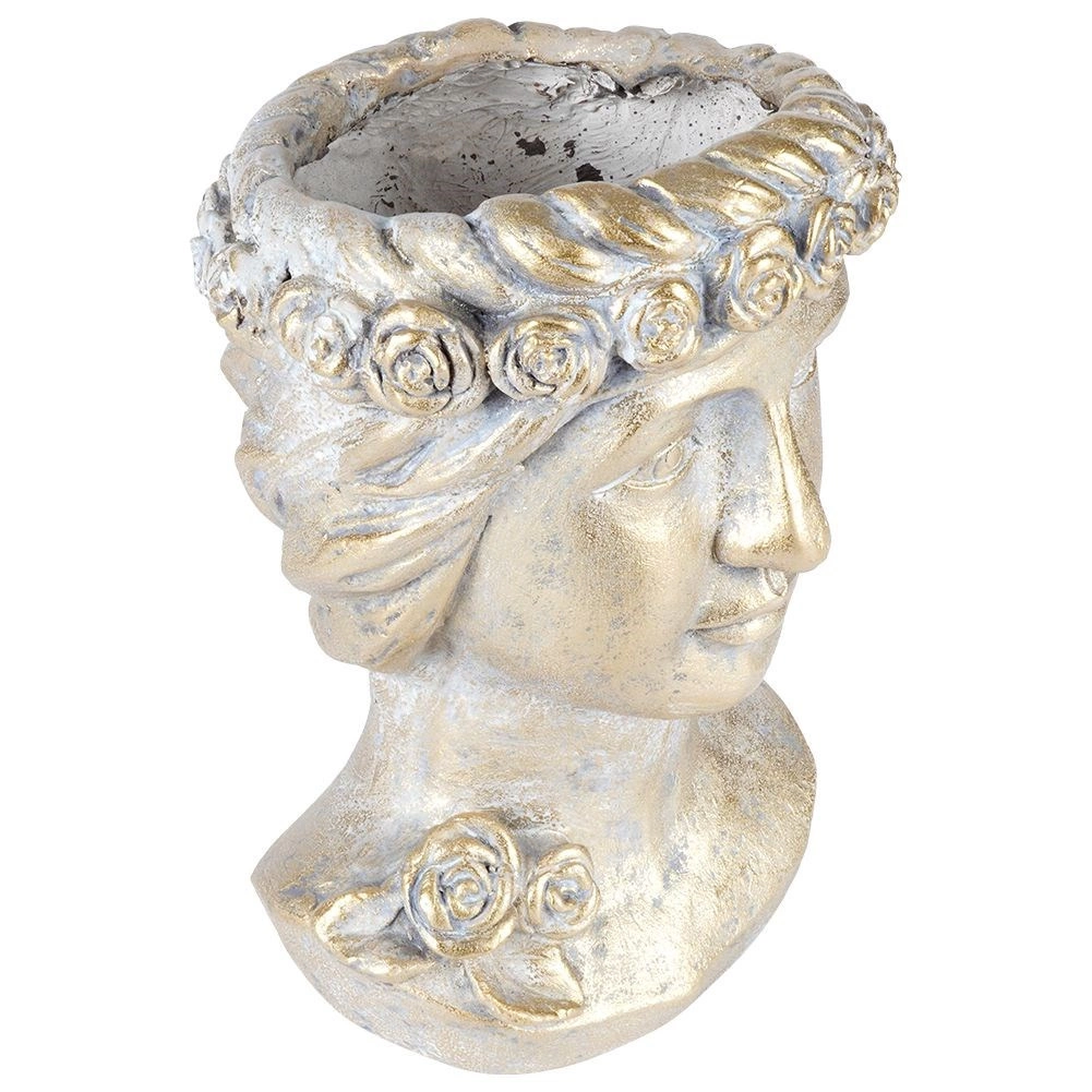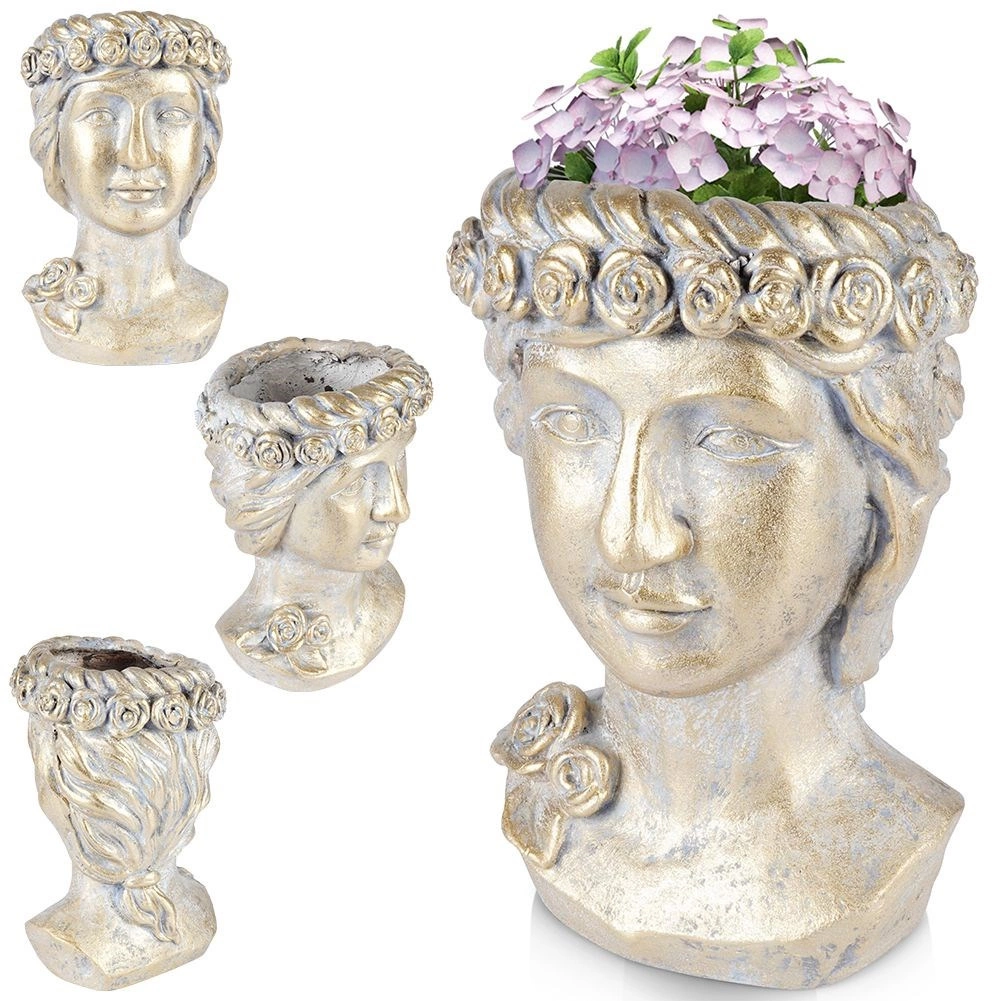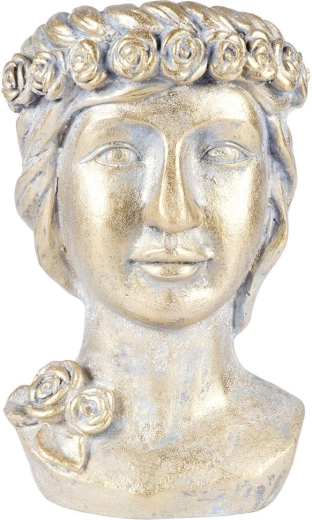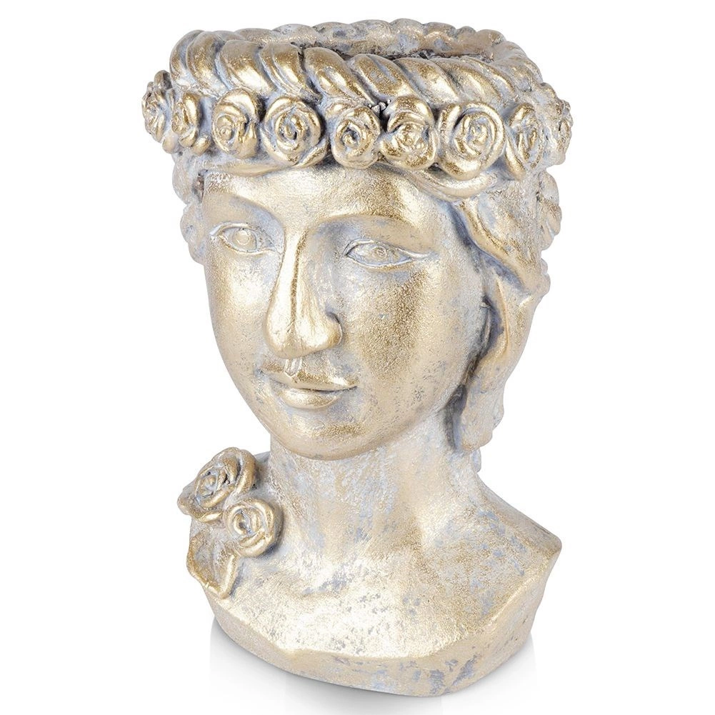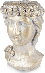 Deze decoratieve bloempot in de vorm van een Griekse buste wordt de blikvanger van elke ruimte. De gouden metallic afwerking met patina benadrukt de reliëfdetails en creëert een luxueuze indruk die perfect past in zowel moderne als klassieke interieurs. Geschikt voor woonkamer, werkkamer en hal.