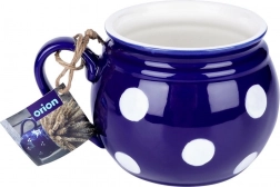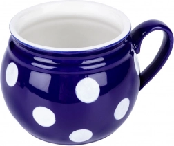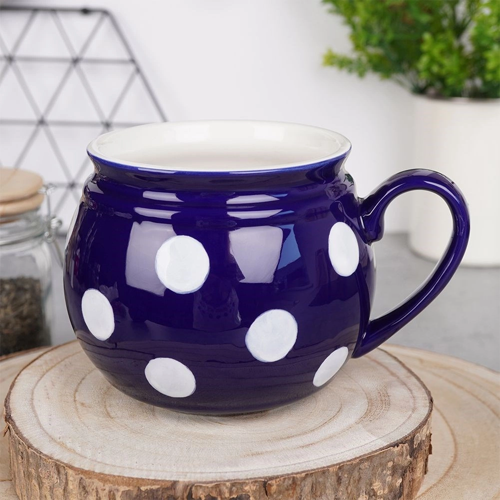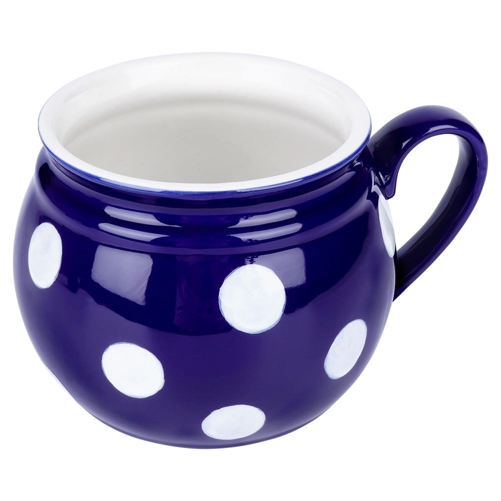 Geniet van je favoriete drankjes in grootse stijl. Deze keramische mok van 850 ml is een uitstekende keuze voor iedereen die houdt van grotere porties thee, koffie of kruidenthee. De klassieke tonvorm, donkerblauwe glazuur en grote witte stippen geven de gedekte tafel flair en combineren mooi met ander servies.
