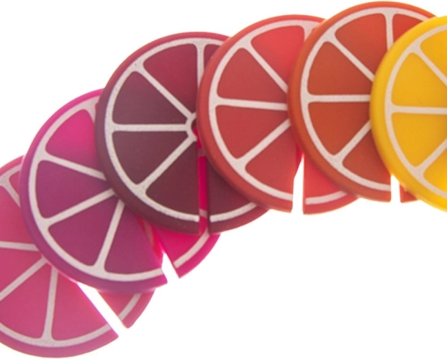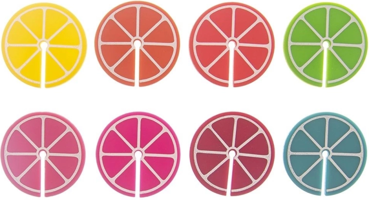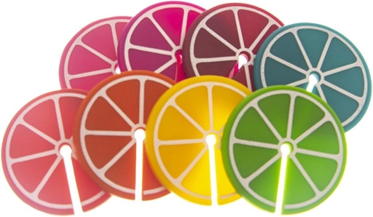 Markeer glazen en bekers snel en stijlvol. De siliconen markers in de vorm van citrusschijfjes bevestig je eenvoudig aan de steel van een wijnglas of aan de bovenrand van een glas. Ze zijn kleurgecodeerd, zodat iedereen zijn kleur gemakkelijk onthoudt en drankjes niet worden verwisseld.