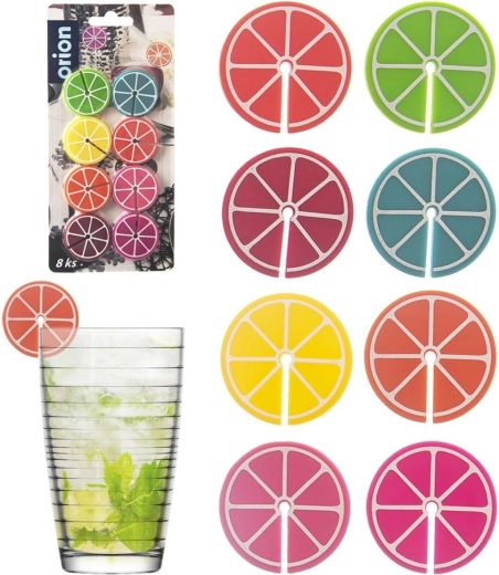 Praktische set van 8 kleurrijke glas- en bekermarkers in de vorm van citrusschijfjes met een diameter van 3,7 cm. Door de verschillende kleuren herkent elke gast eenvoudig zijn drankje. Gemaakt van siliconen, geschikt voor hergebruik, ideaal voor feestjes en familiebijeenkomsten.